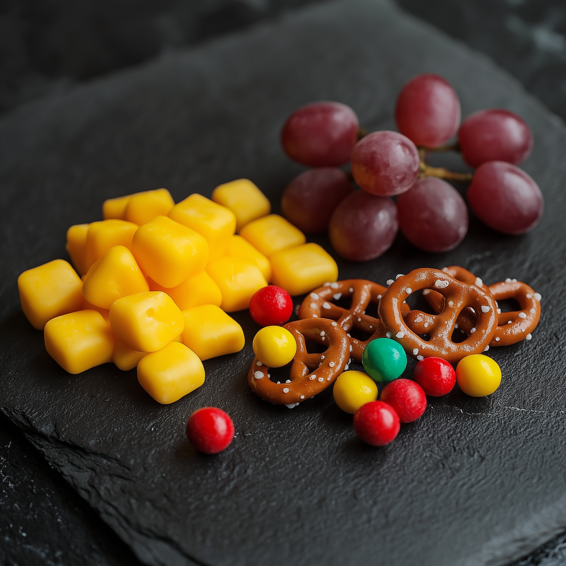 The image features a vibrant assortment of small cheddar cheese bites, pretzels, fresh red grapes, and colorful skittles arranged beautifully on a sleek black stone surface. The 3/4 view enhances the visual appeal, highlighting the textures and colors of the snacks.