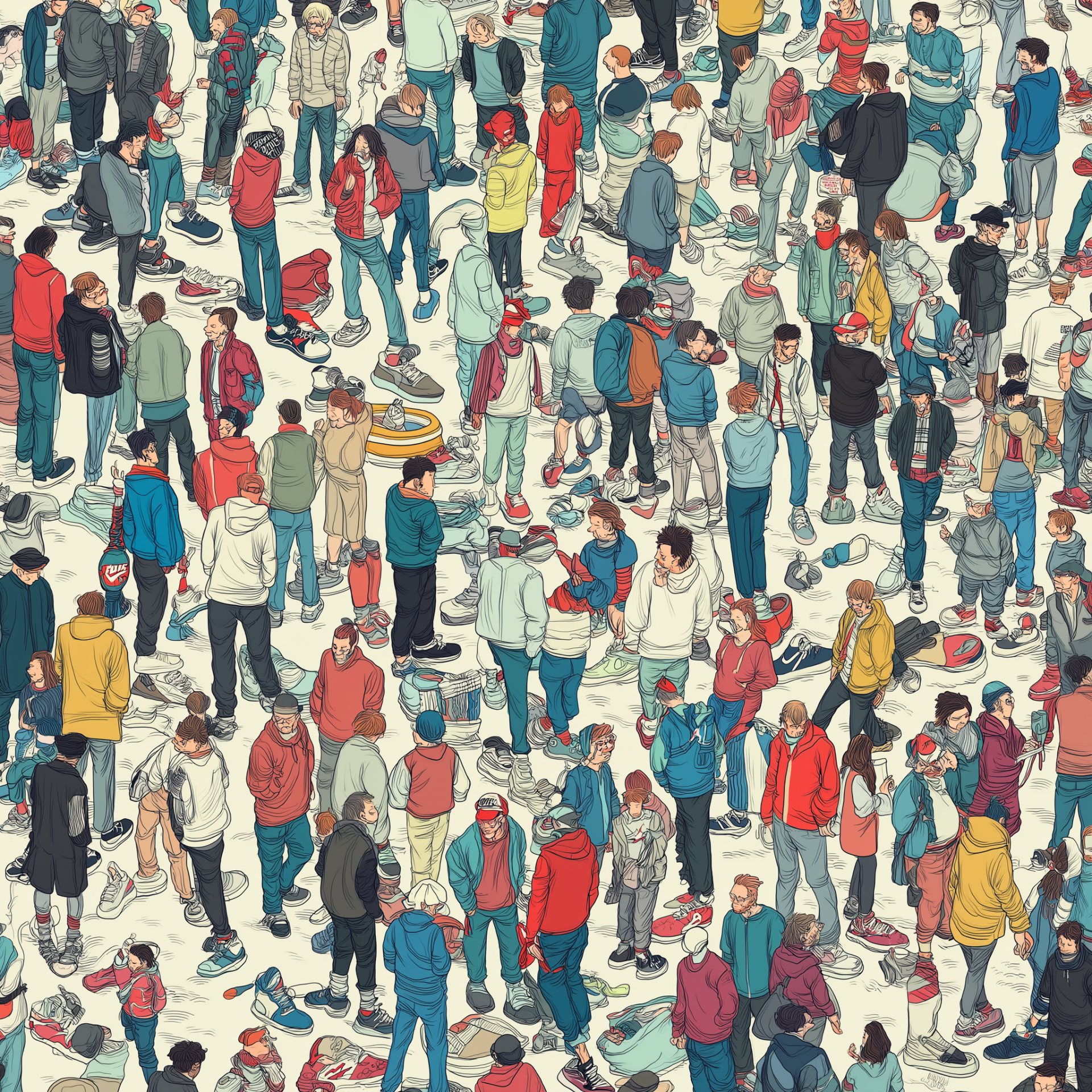 This vibrant illustration features a chaotic scene filled with various activities and colorful characters. Sneakers are cleverly hidden throughout the image, creating an engaging search experience for viewers.