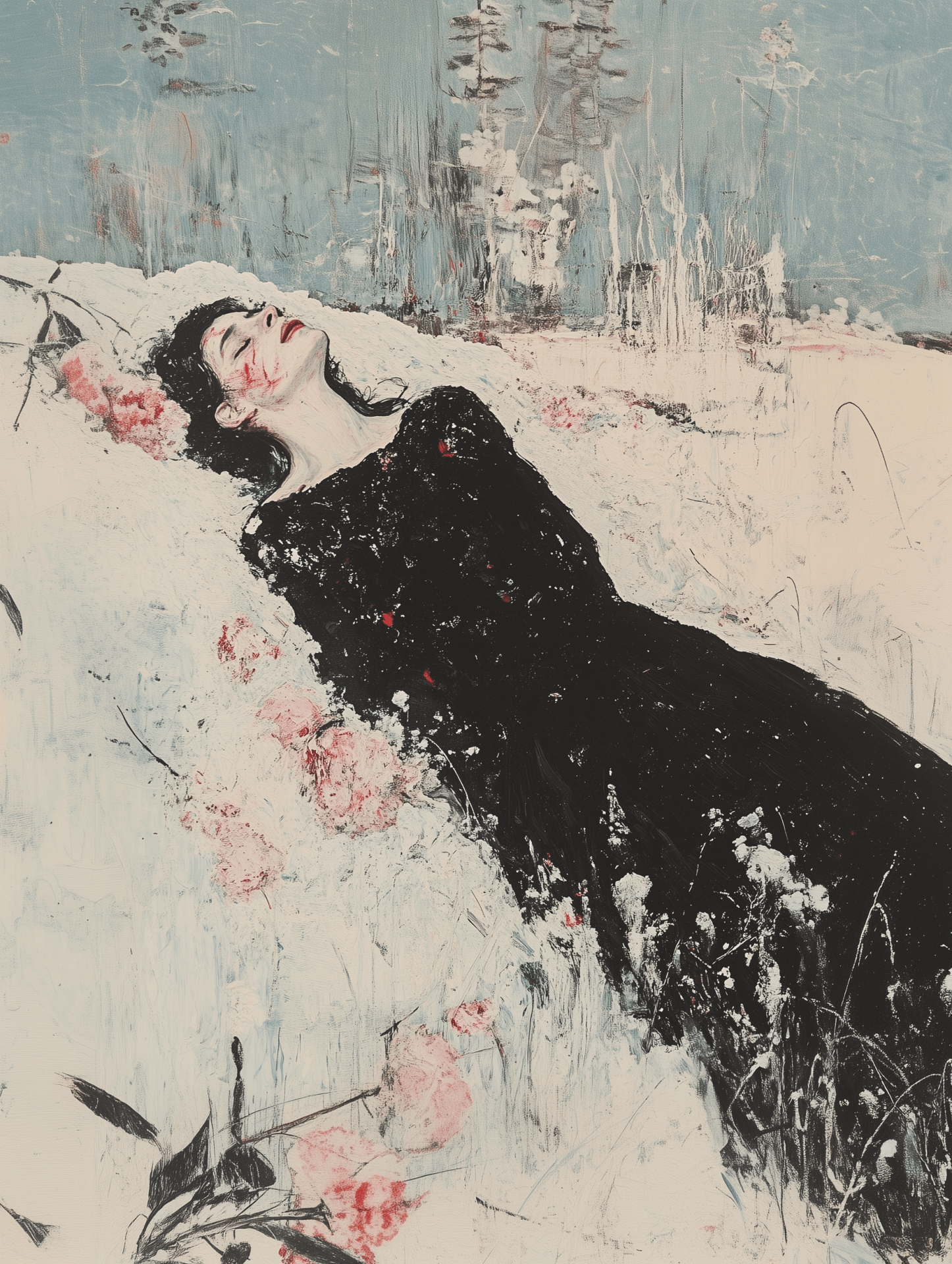 A long shot of a woman partially buried in a snowy landscape, creating a striking contrast against the vibrant colors of the surroundings. The scene captures the serene yet surreal quality of winter, evoking a sense of stillness and quiet beauty.