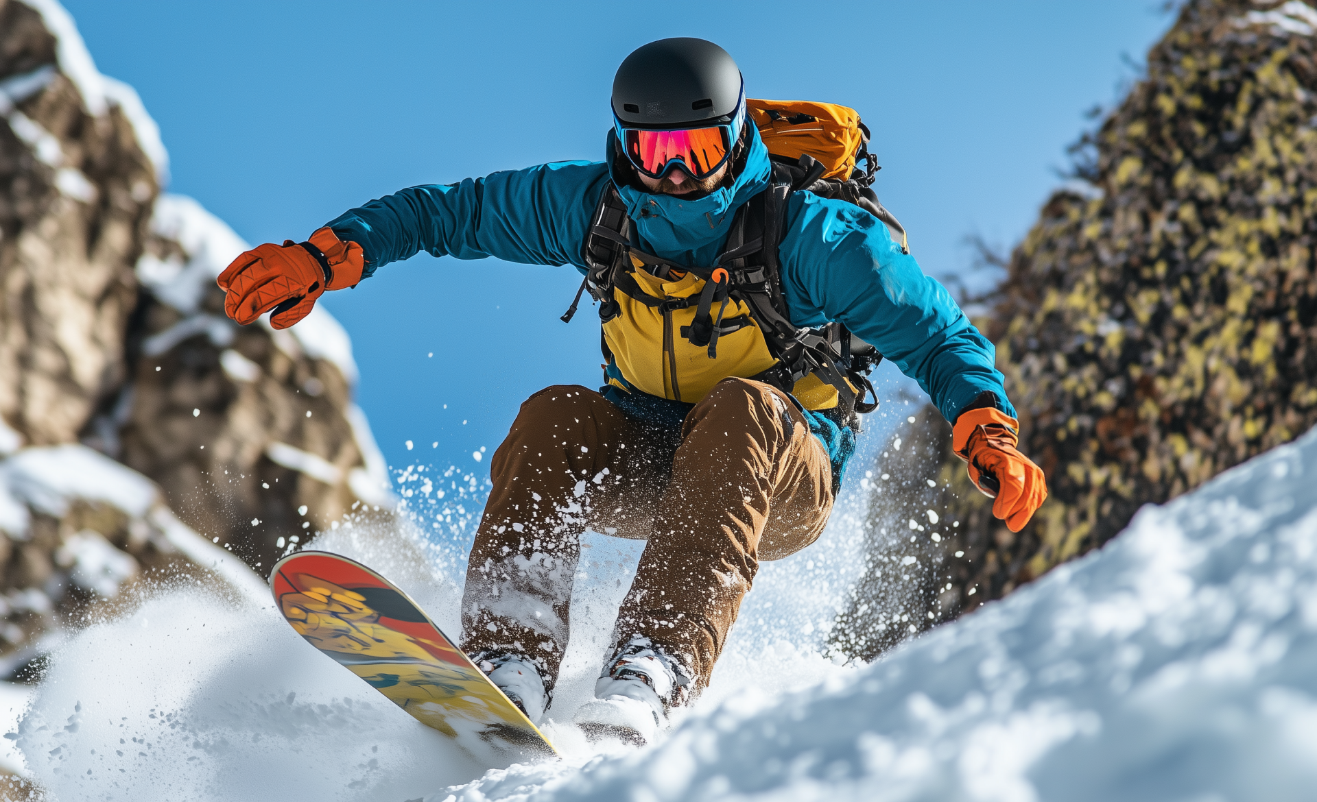 The image captures a dynamic snowboarder executing an impressive air trick against a backdrop of snowy mountains. The action is frozen in time, showcasing the thrill and excitement of winter sports.