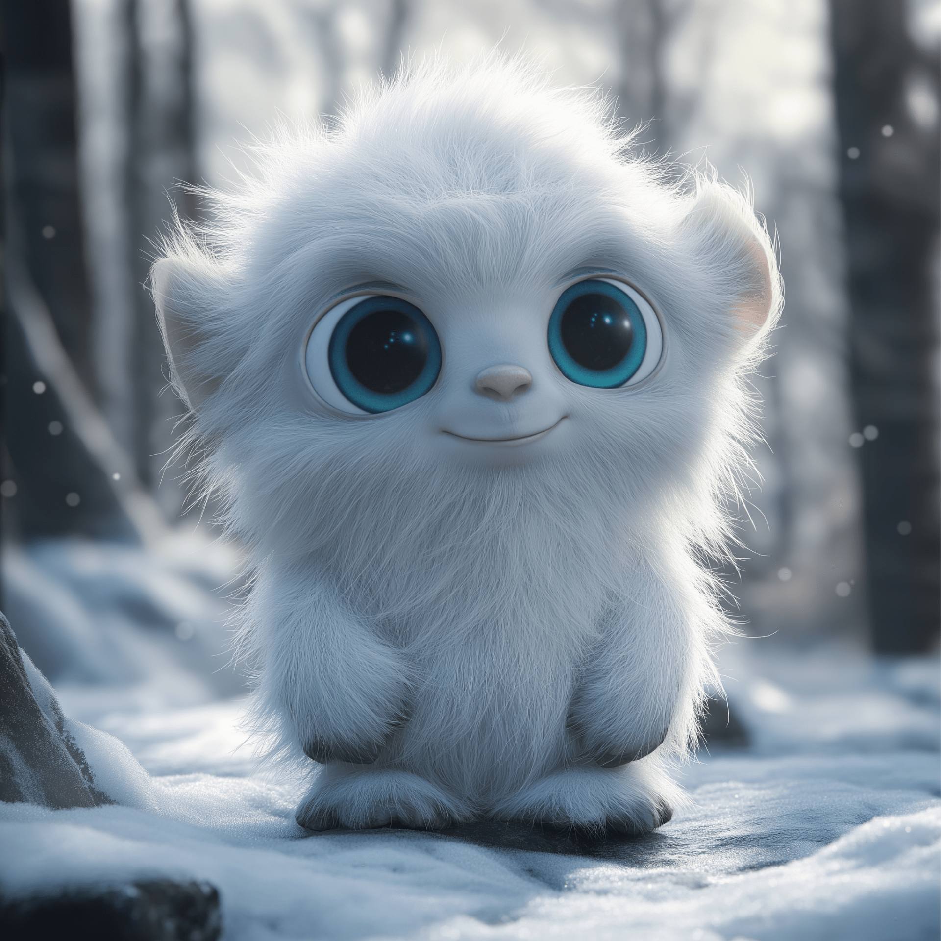 The image captures a hyper-realistic yeti, characterized by its soft, fluffy white fur resembling freshly fallen snow. With big expressive eyes, the young yeti exudes a sense of innocence and charm, portrayed in a warm and inviting environment.