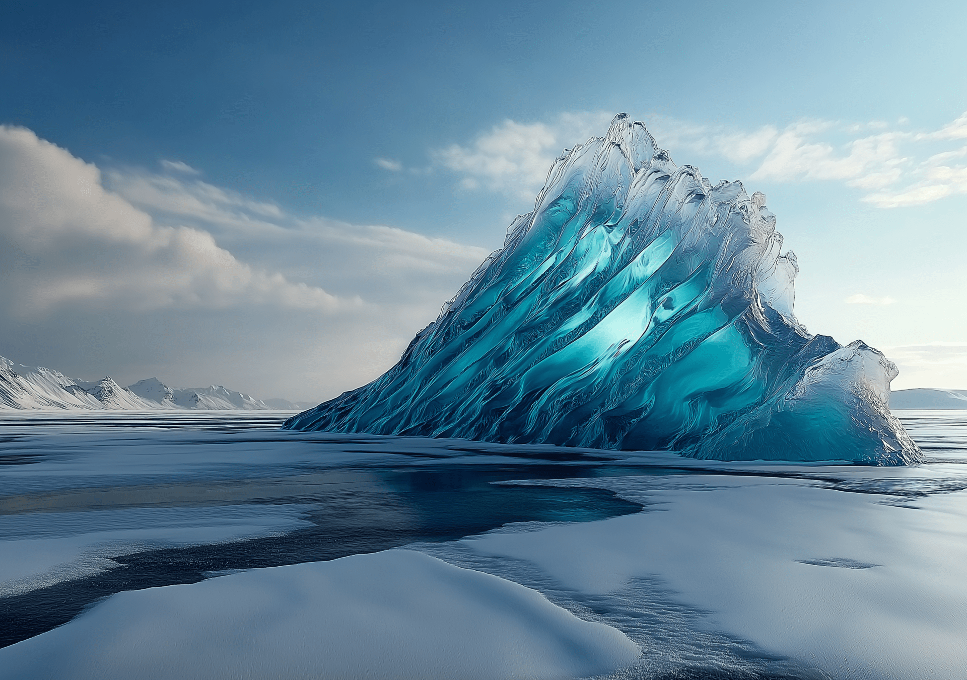 The image showcases a breathtaking ice cap blanketed in pristine snow, highlighting the vibrant blue ice formations within. The striking contrast between the deep blue and the soft white creates an enchanting visual experience.