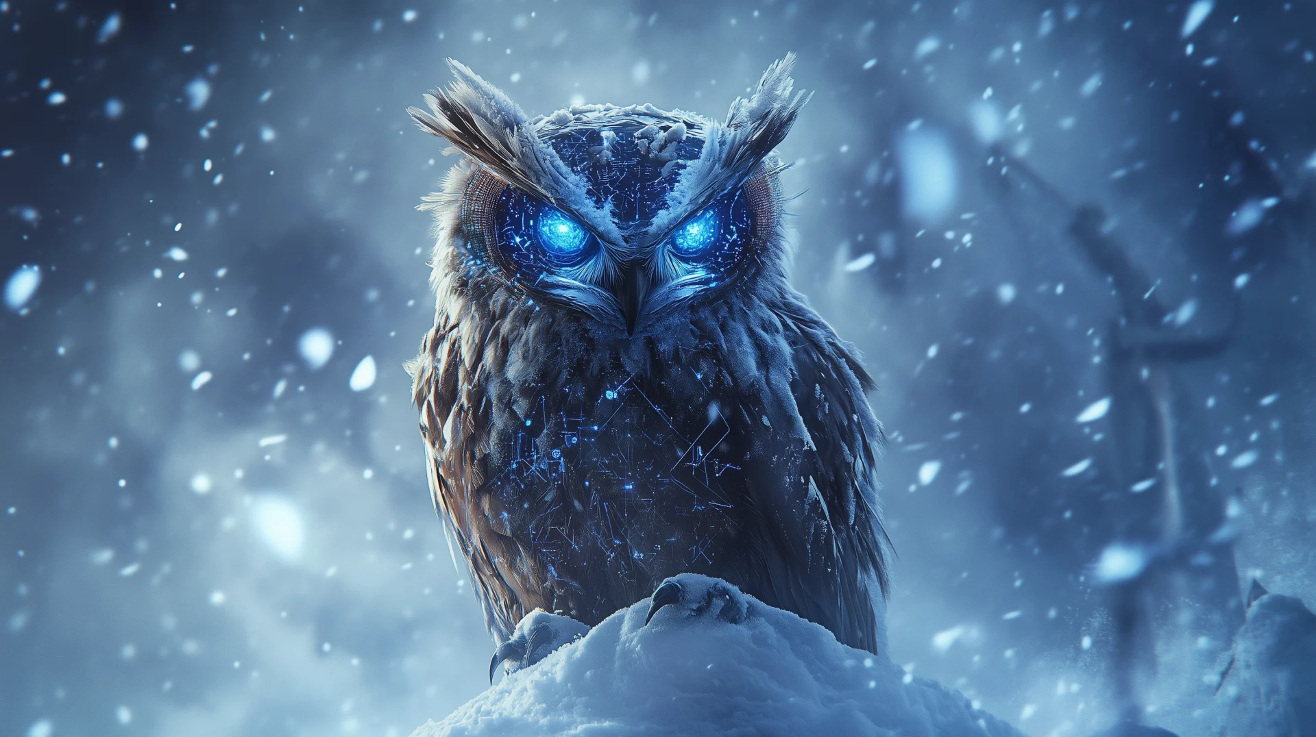 The image showcases a cat mid-run, with a flurry of snowflakes swirling around it. The dark background contrasts beautifully with the illuminated snowflakes, creating a magical winter scene.