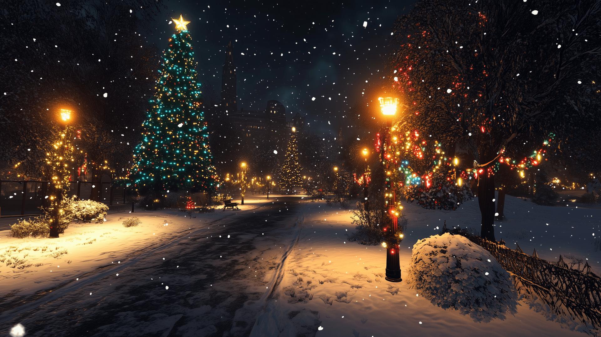 The image depicts a picturesque city park blanketed in a thick layer of fresh snow, creating a serene winter scene. Twinkling lights and colorful garlands adorn the trees and pathways, while the night sky features a mesmerizing aurora borealis and bright stars.