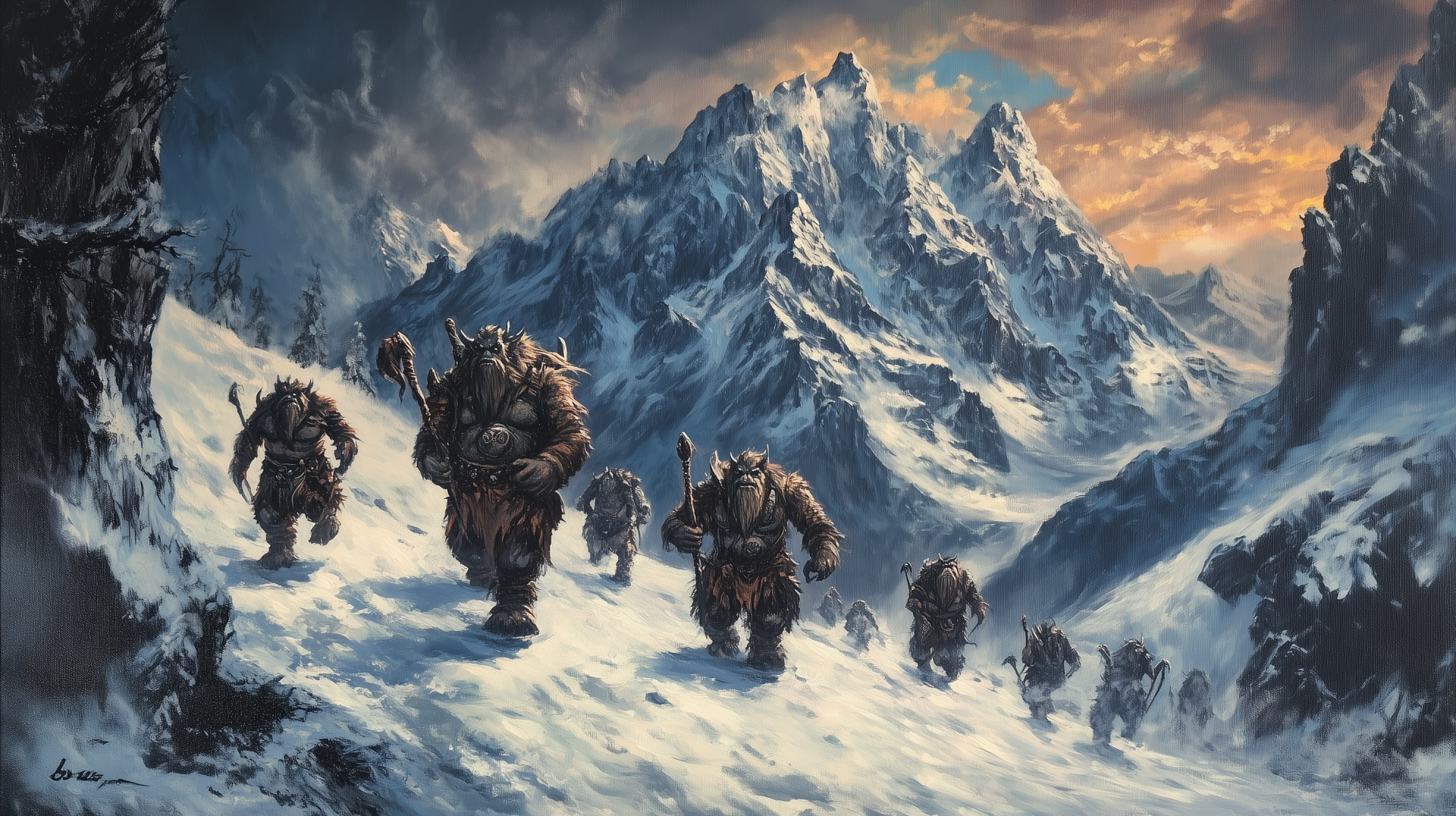 This illustration features a whimsical scene of trolls and giants traversing a snowy mountain pass. The vibrant colors and dynamic figures evoke a sense of adventure and fantasy.