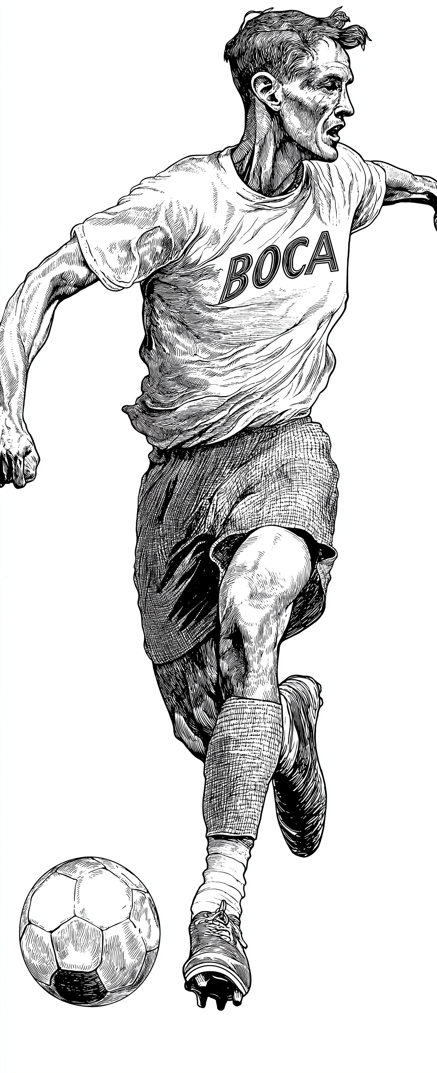 This image features a simple black and white line drawing of an early soccer player, depicted in motion as he runs after a ball. The minimalist background enhances the focus on the player's burlap shorts and shirt, creating a classic and timeless feel.