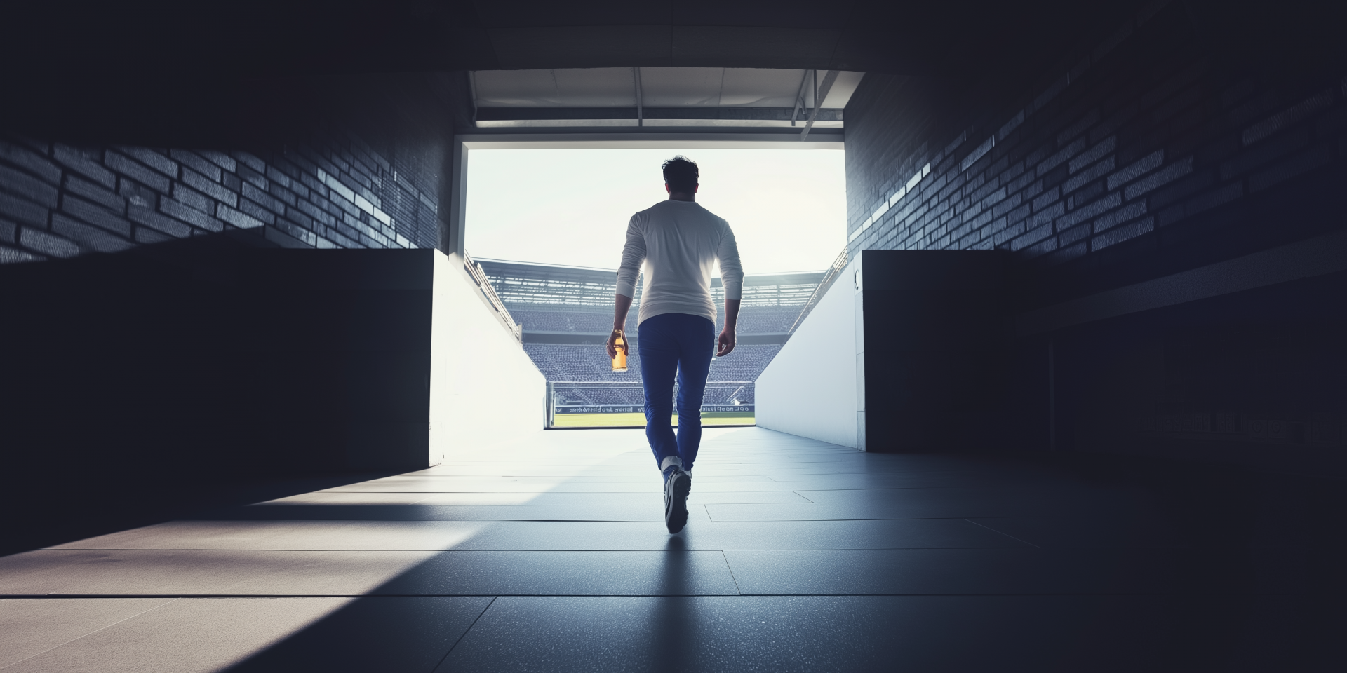 A male soccer fan wearing a white sweater and blue pants is seen walking backwards as he enters the vibrant soccer stadium. The image captures a lively backlit atmosphere, enhanced by the excitement of the game ahead.