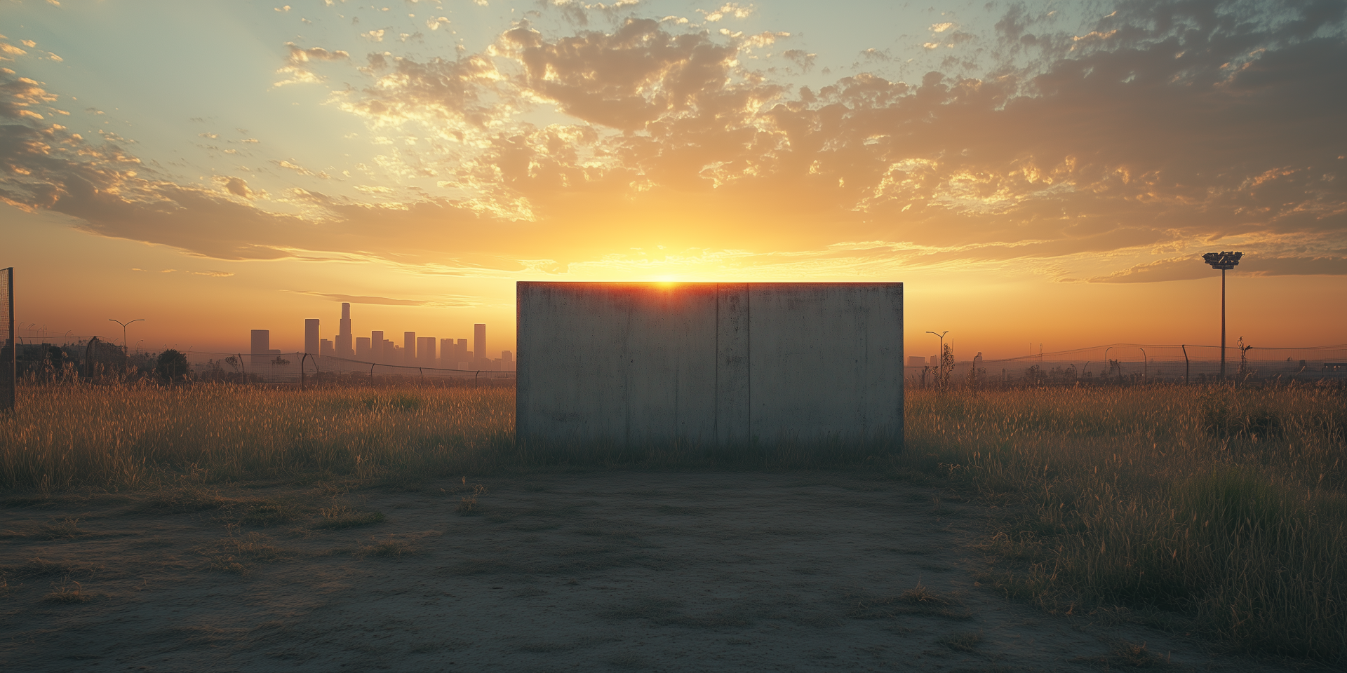 The image captures a soccer field dominated by a large cinder block wall at its center, set against a stunning sunset. In the background, the iconic Los Angeles skyline is illuminated, creating a striking contrast with the warm hues of the sky.