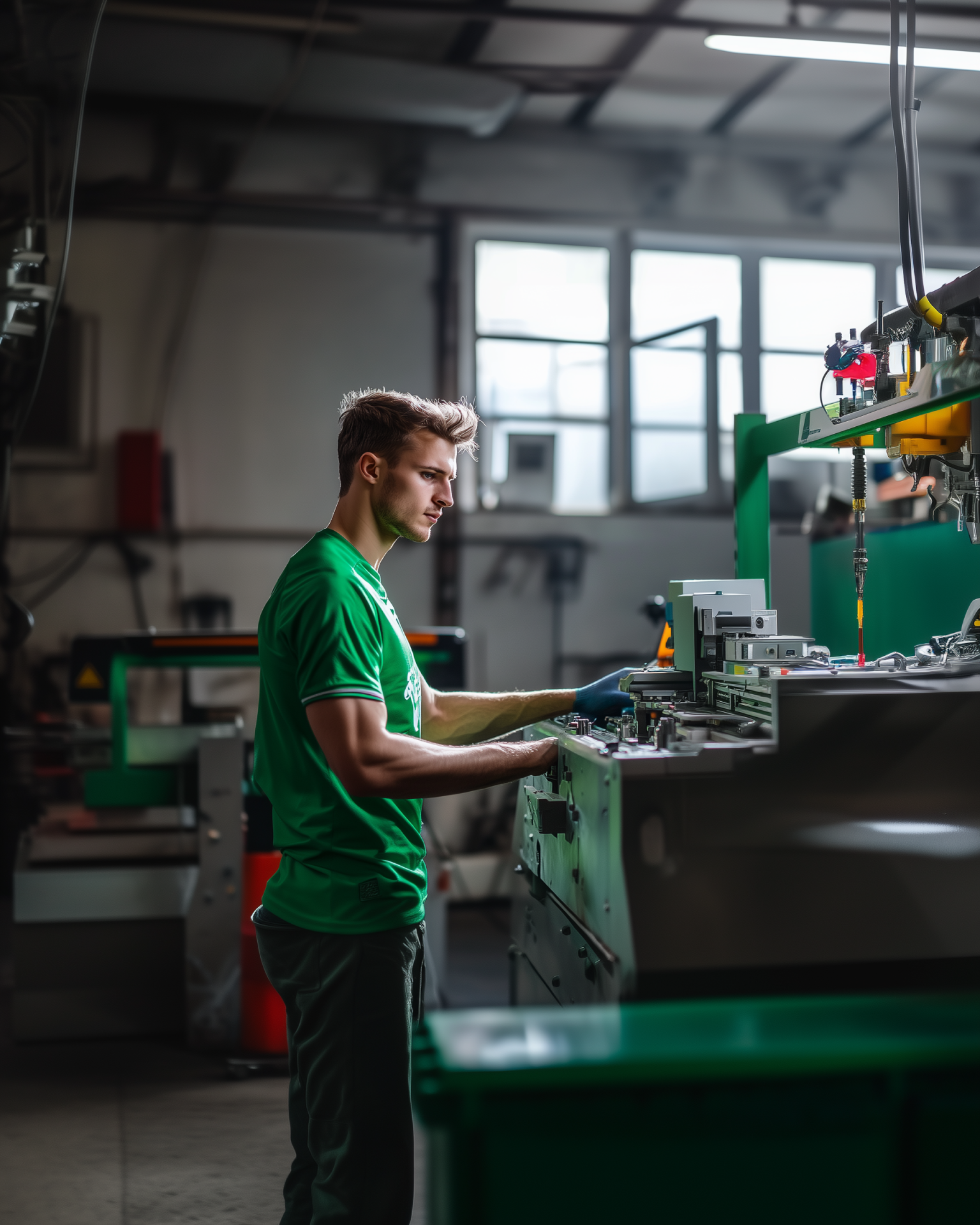 A young man dressed in a vibrant green soccer jersey is focused on operating a high-tech injection molding machine. The ultra-realistic image captures the intensity and precision of the moment, with sleek machinery gleaming in the background.