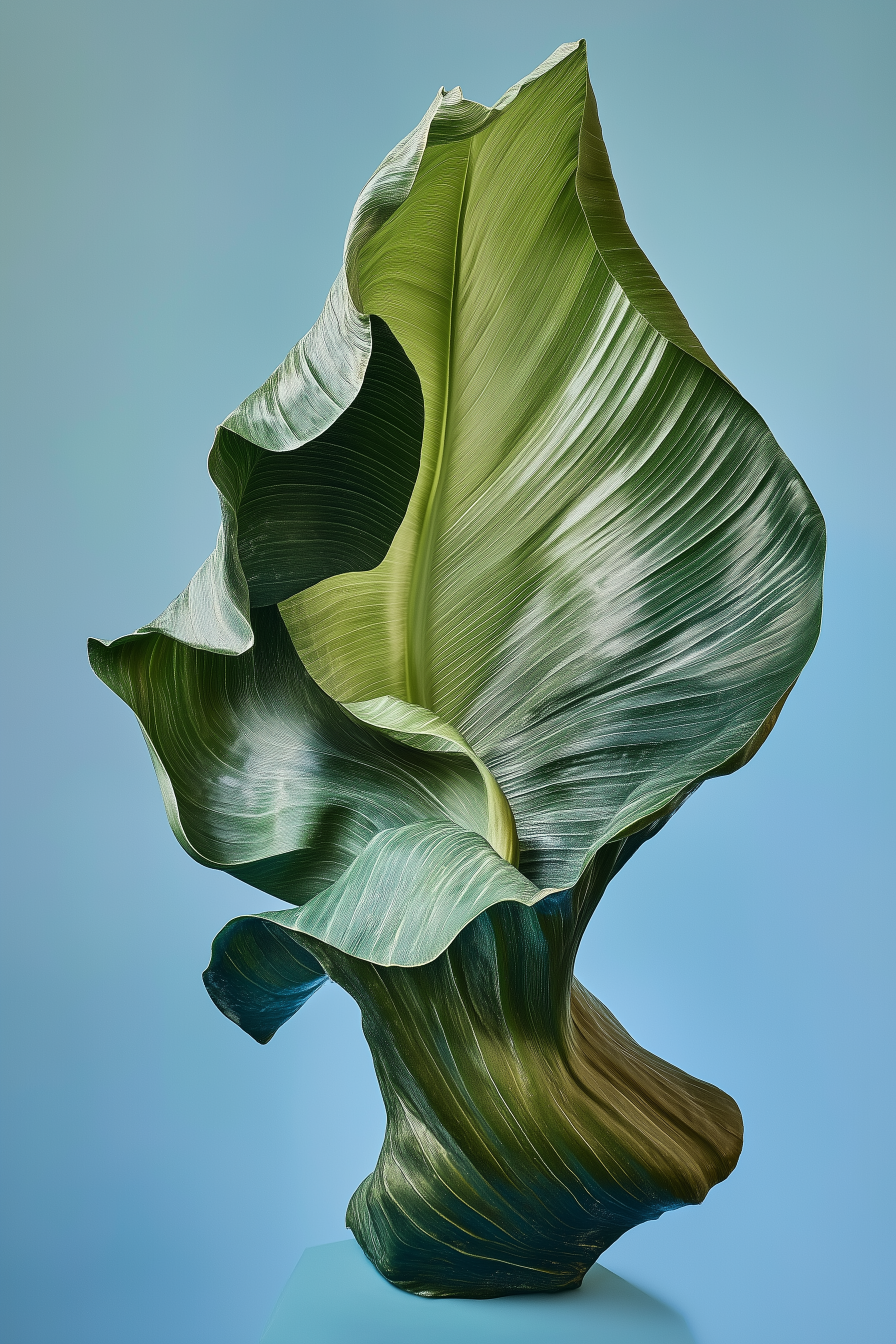 This image features a large banana leaf with gracefully curved edges, creating an abstract resemblance to a nebula. The minimalistic style is highlighted by the soft light blue sky background, evoking a sense of tranquility and nature's elegance.
