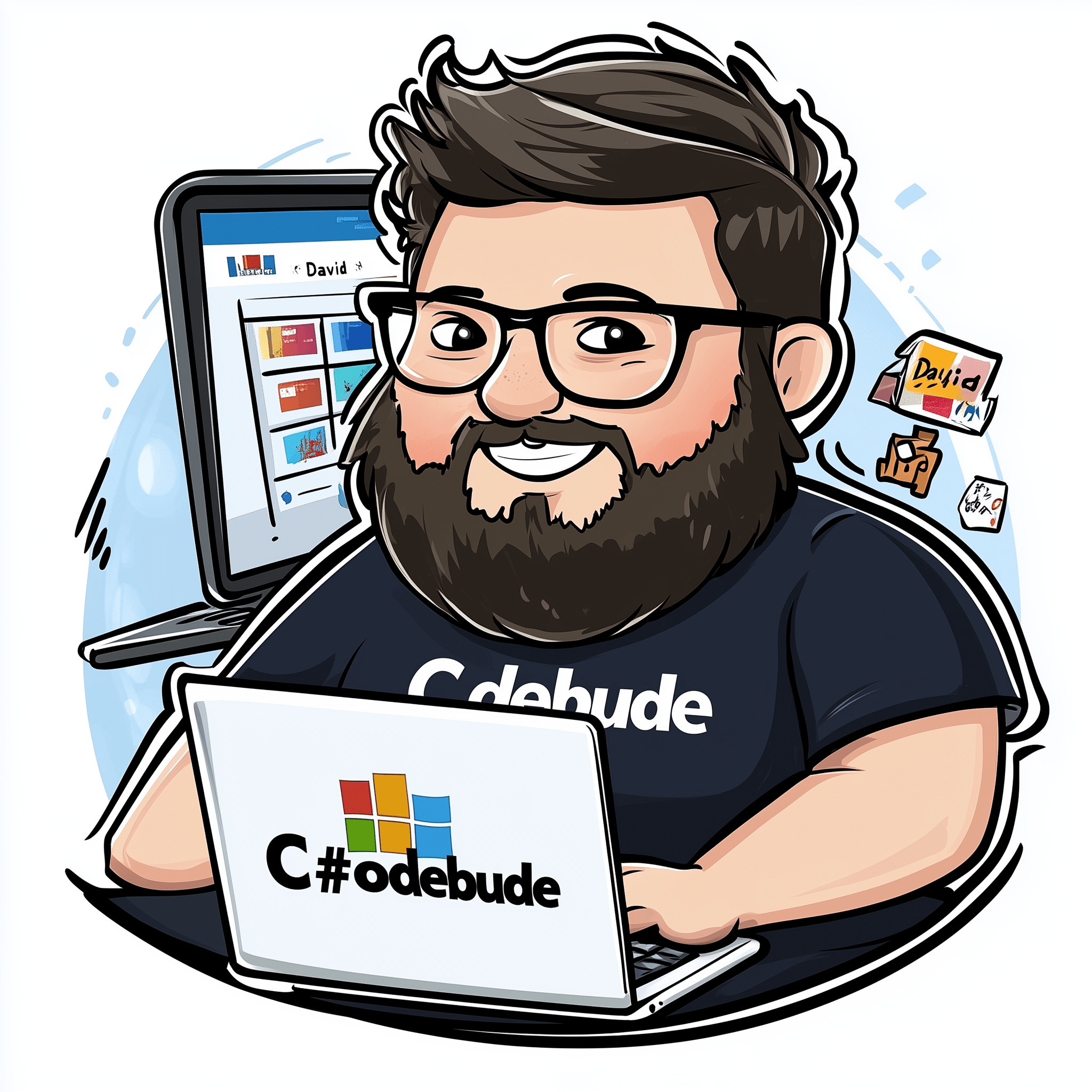 The image features a playful illustration of a chubby gentleman with stylish hair and glasses, engrossed in his work. In the backdrop, a computer screen displays code within a Windows-themed environment, creating a tech-savvy atmosphere.