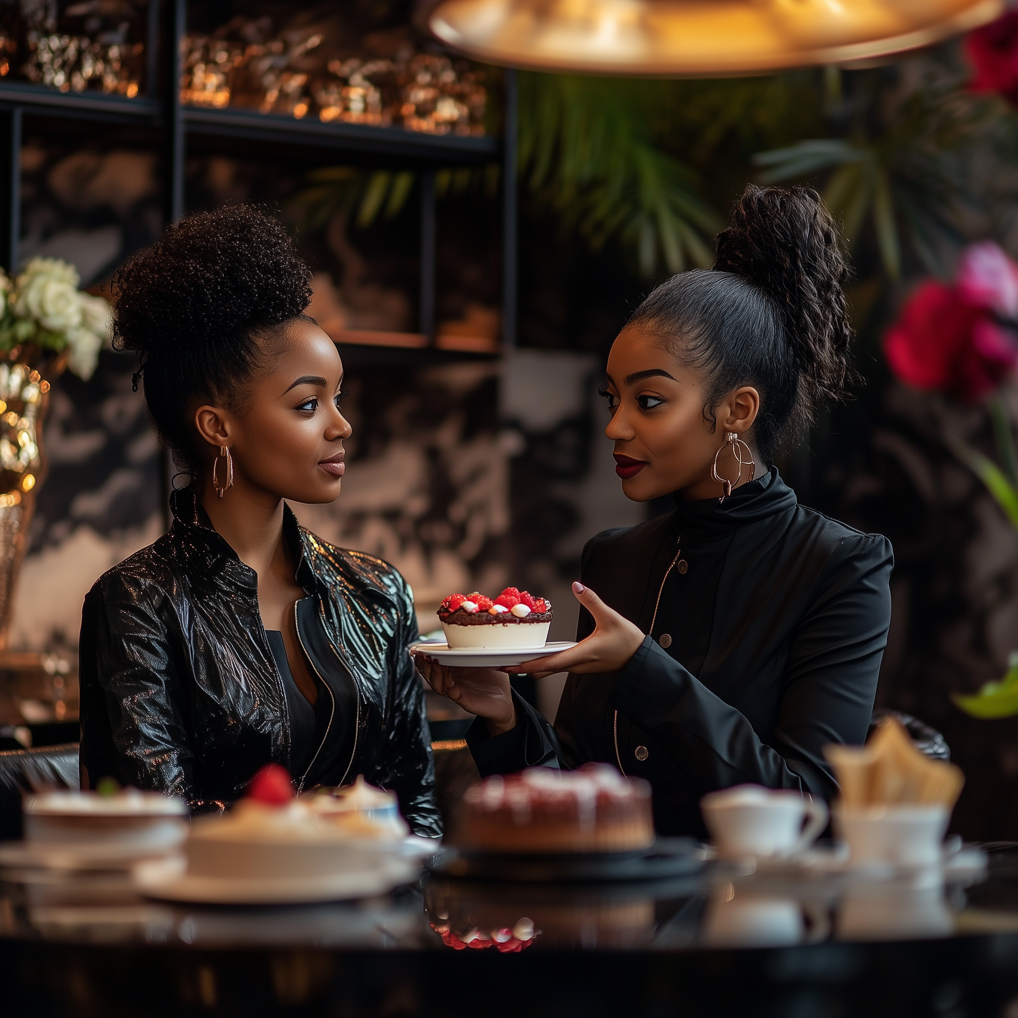 The image depicts two black women enjoying coffee and cake in a beautifully designed luxury cafe. The ambiance features a dark theme, with elegant decor that enhances the sophisticated atmosphere.