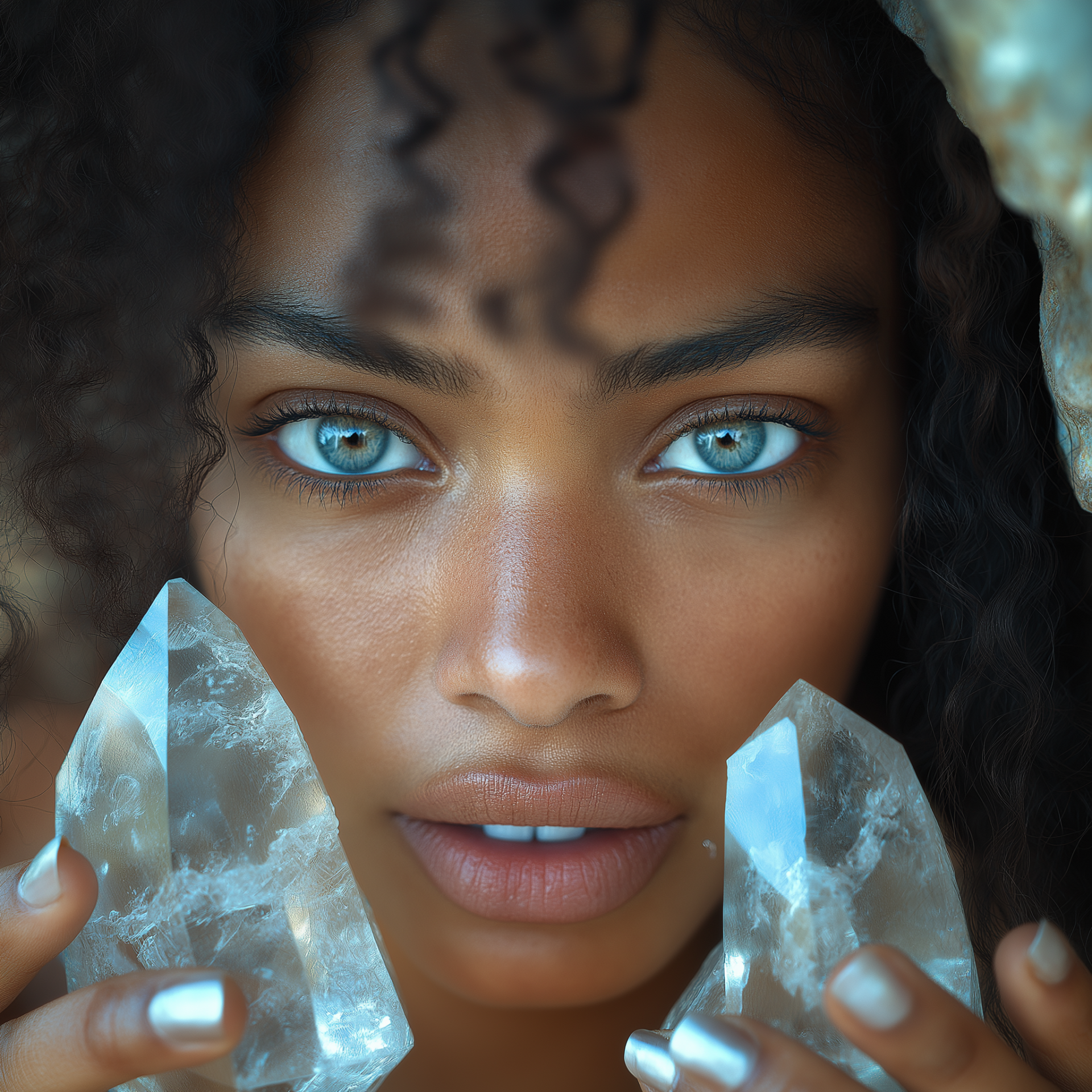 This high-quality photo captures a black woman from Louisiana gazing intently through a mystical voodoo crystal. The lighting and textures create a sense of intrigue and spiritual connection.