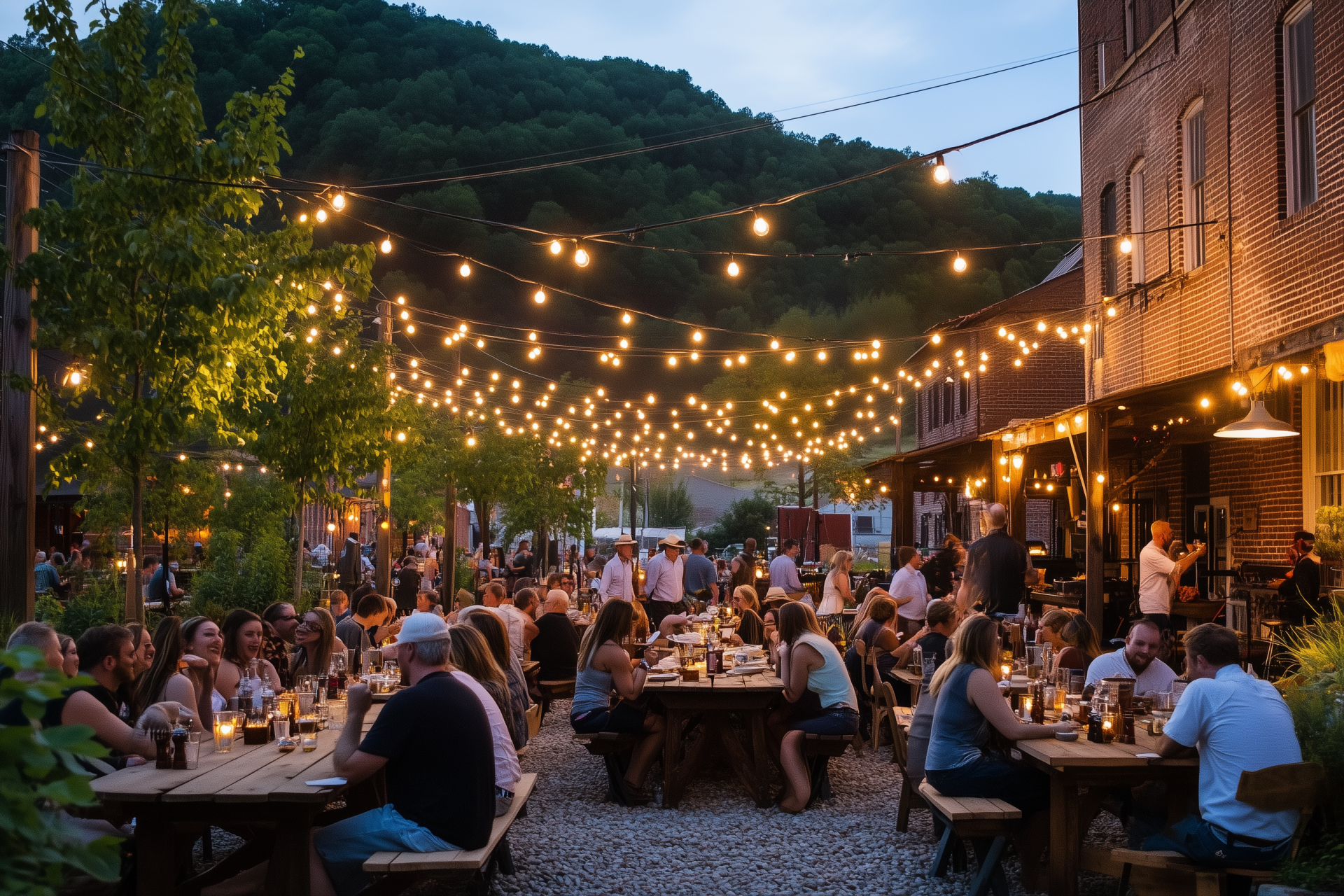 This image captures a lively outdoor dining scene in Tennessee, filled with vibrant colors and southern charm. The atmosphere is warm and inviting, showcasing a blend of rustic tables, cheerful decorations, and people enjoying their meal under the sun.