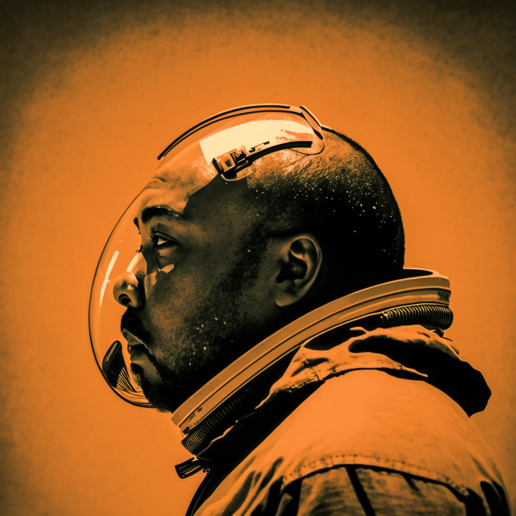The image features a figure wearing a vintage space helmet with a reflective sun visor, reminiscent of 1950s and 1960s sci-fi aesthetics. The overall color palette and design elements evoke a sense of adventure and exploration beyond Earth.