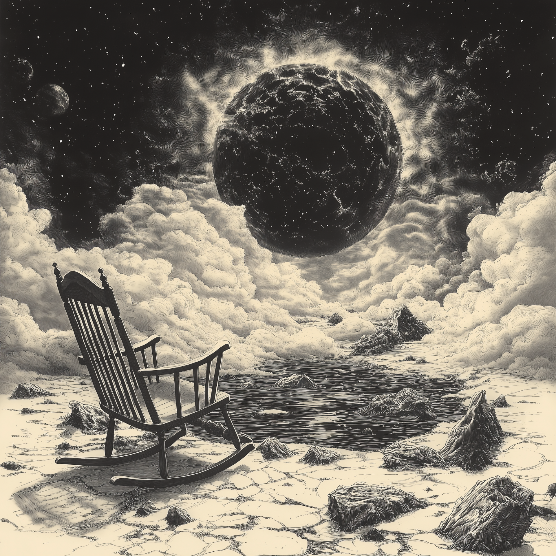 This illustration features a whimsical line drawing of a rocking chair that appears to be floating through a vibrant portal in the vastness of space. The contrasting elements of the familiar rocking chair and the surreal background create a captivating sense of wonder and imagination.