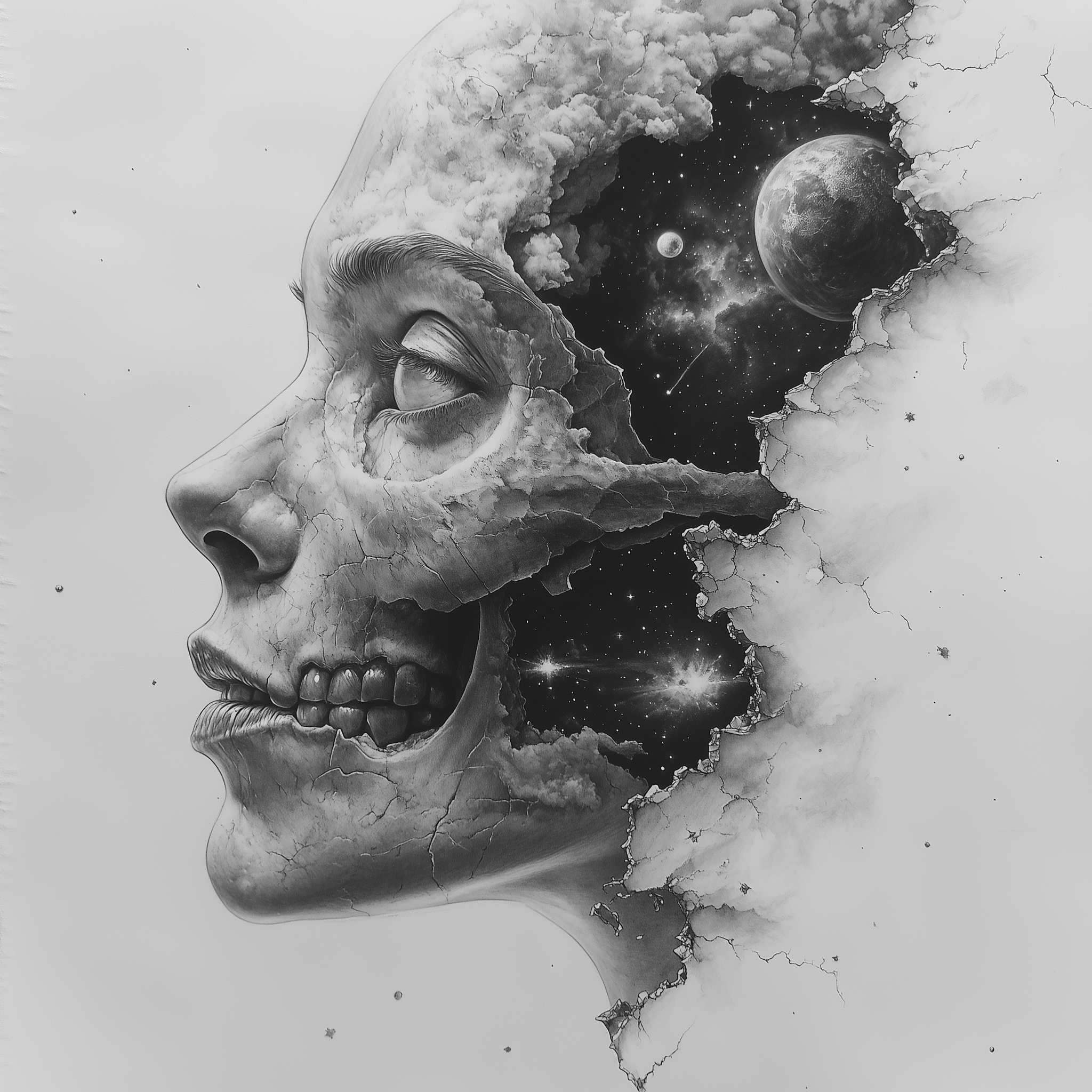 This hyper-realistic illustration features a black and grey skull of a woman in a side view. Galaxies and planets emerge from the head, creating a celestial scene filled with stars and cosmic elements.