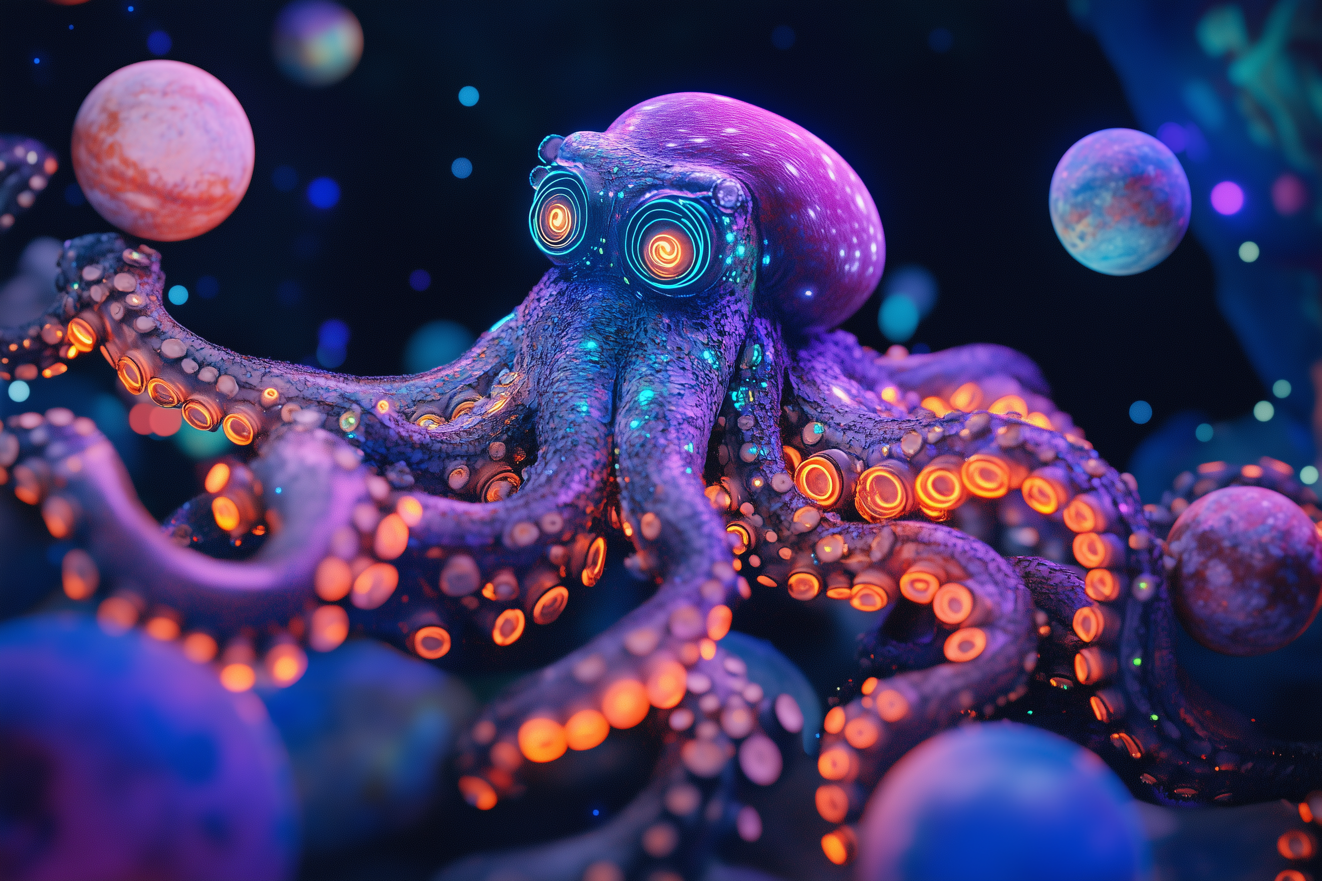 The image showcases a futuristic octopus with mechanical tentacles, gracefully suspended in a cosmic backdrop filled with twinkling stars. It holds vibrant planets that shine like marbles, illuminated by neon highlights, creating a surreal and captivating scene.