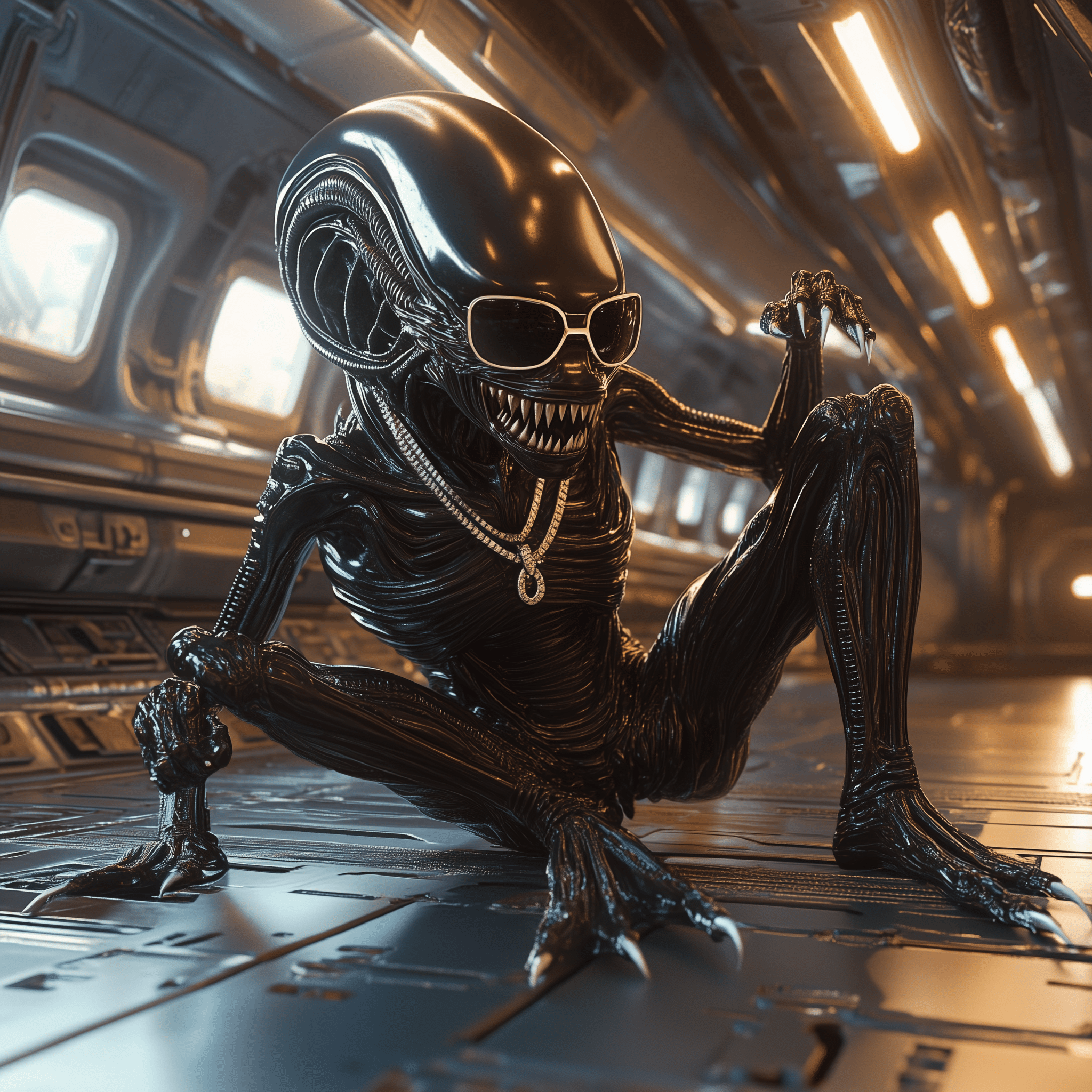 The image features a lively alien xenomorph dressed in flashy sunglasses and bling, showcasing its breakdancing moves on a futuristic spaceship floor. The vibrant colors and energetic pose convey a playful and dynamic atmosphere.