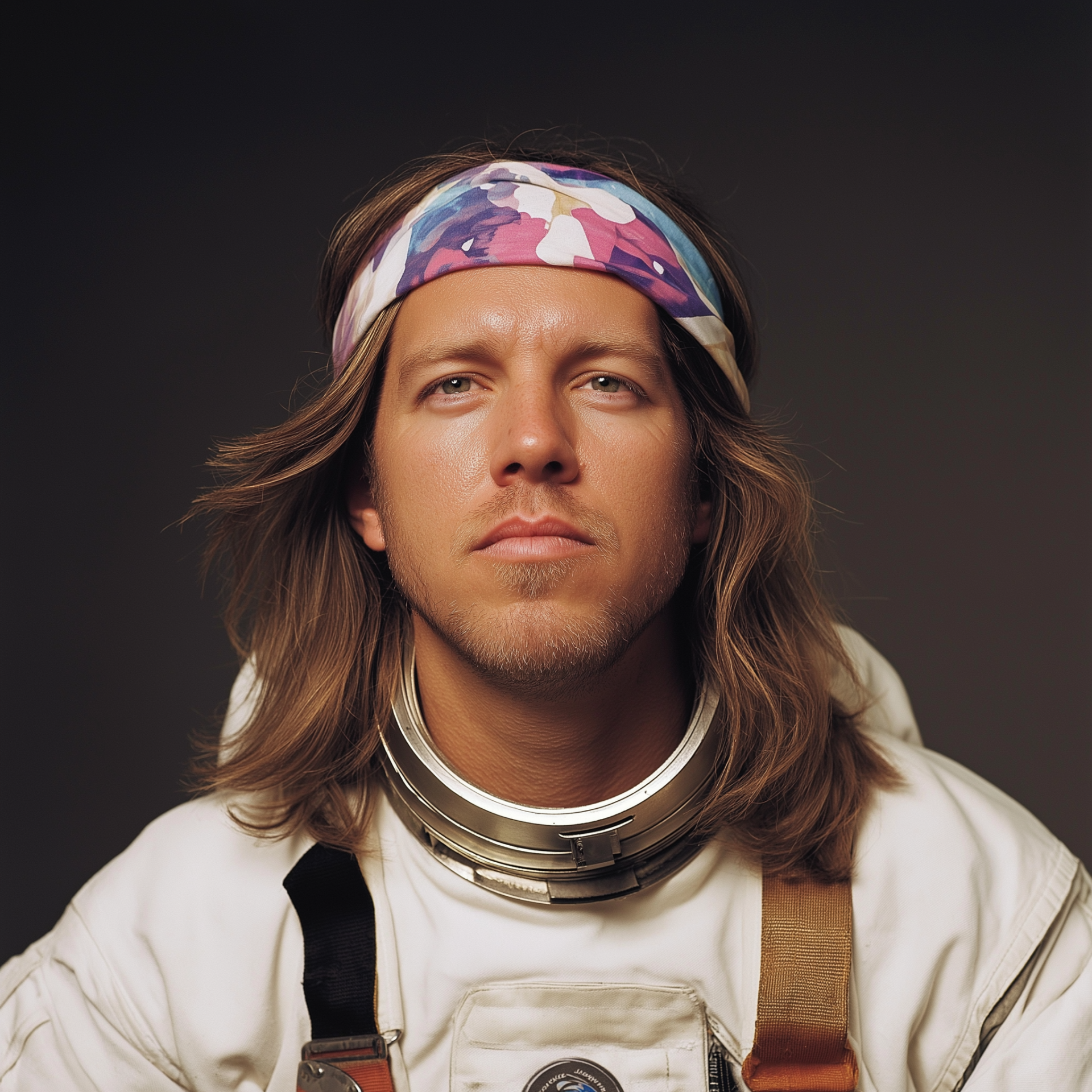 The image showcases a young man with long light brown hair, proudly donning a colorful cloth handkerchief and a unique space suit. The style evokes a retro sci-fi magazine cover from the 70s, filled with vibrant colors and a sense of playful imagination.