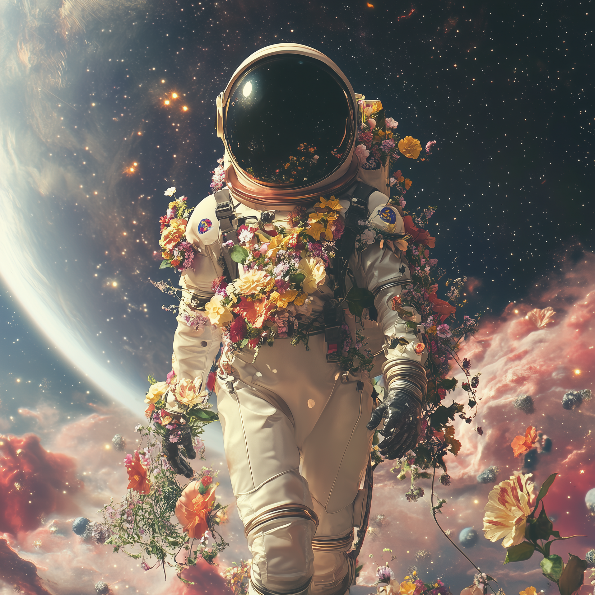 The image depicts a girl astronaut walking gracefully in the vastness of open space. Her spacesuit, adorned with flowers, contrasts beautifully against the starry background, creating a serene and imaginative atmosphere.