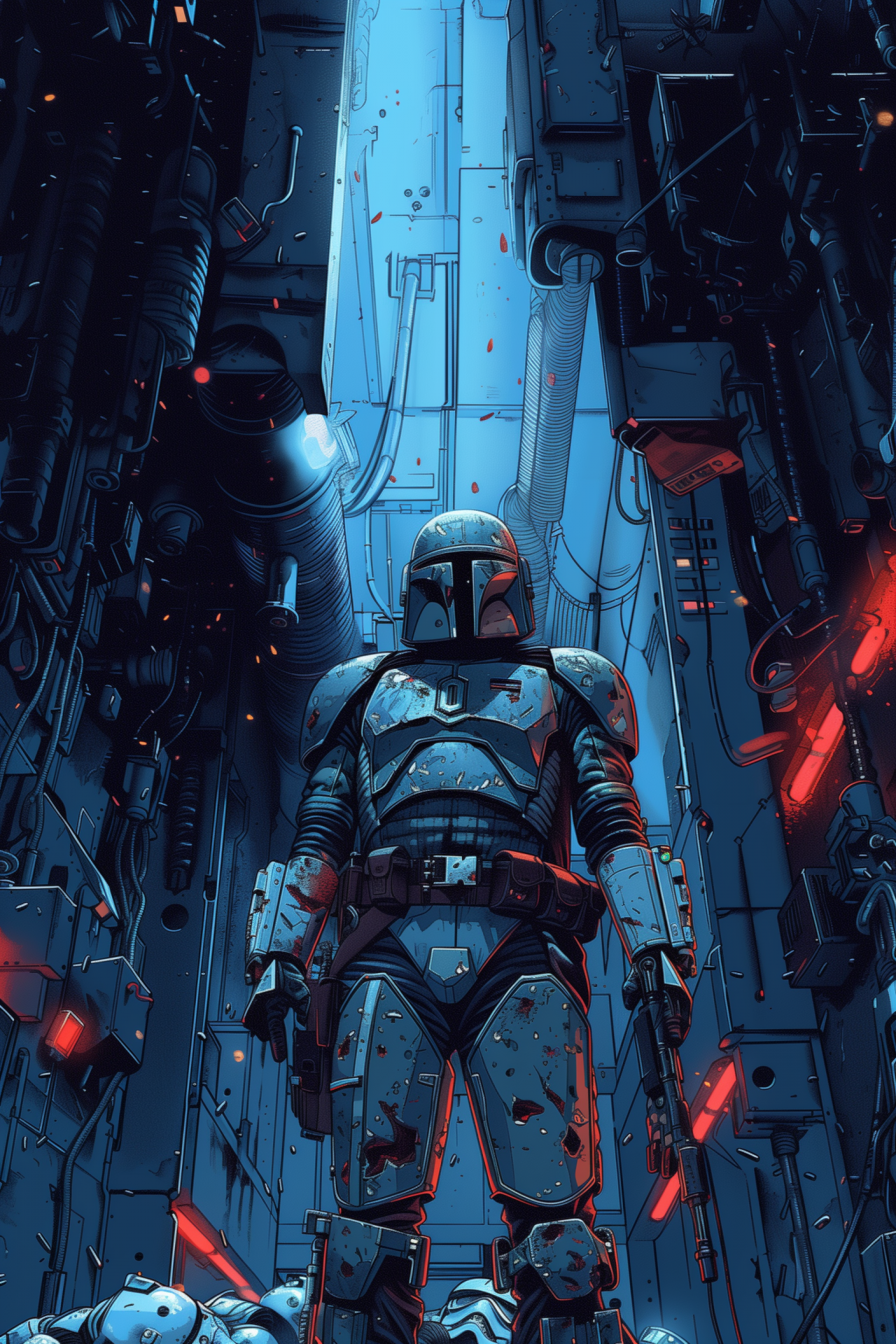 The image captures a powerful scene of a bounty hunter in full costume navigating through a derelict space station. Twisted corridors filled with blue and red emergency lights create a comic horror atmosphere, featuring remnants of a fierce battle with stormtrooper remains scattered on the floor.