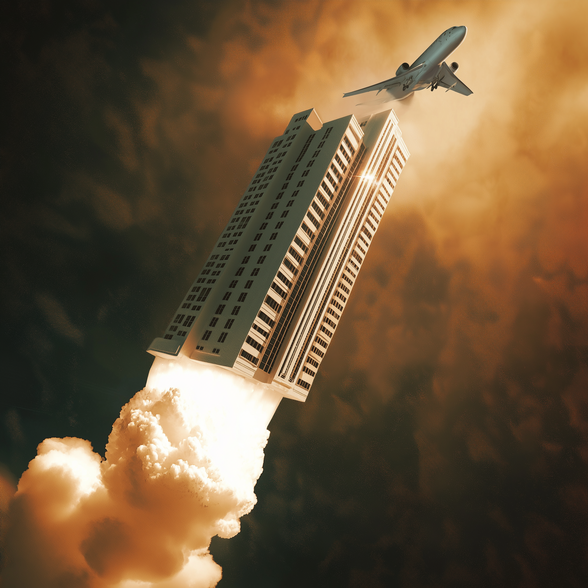 This realistic photo depicts a condominium being propelled through the vastness of space by a jet. The scene captures a unique blend of architecture and futuristic technology, evoking a sense of adventure and exploration.