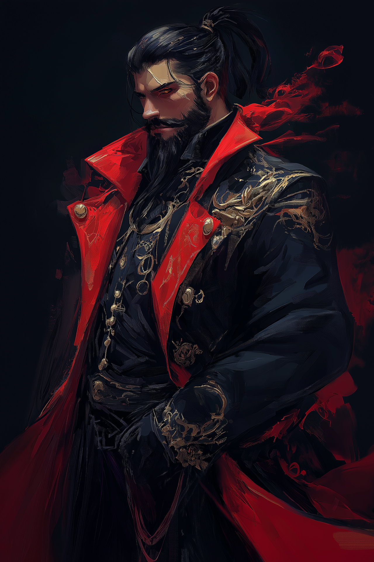 This illustration features a space pirate with a striking appearance, showcasing a short black beard and long hair styled back. Dressed in a black and red ornate long coat, the character embodies a futuristic and edgy vibe typical of cyberpunk art.