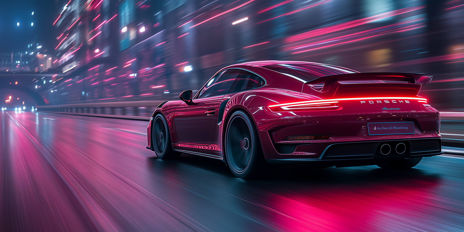 The image showcases a sleek black Porsche speeding down a road, leaving a trail of colorful light streaks behind. The background is illuminated with vibrant dark purple and pink hues, creating a dynamic and energetic atmosphere.