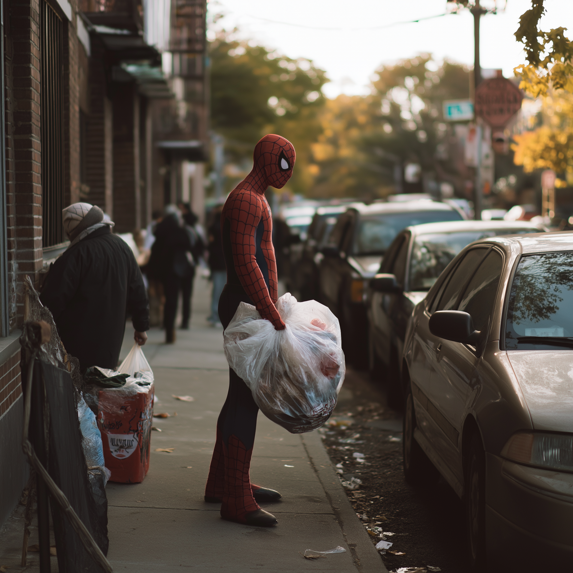 This photograph captures a unique moment of a superhero casually engaging in a mundane task. The image juxtaposes the iconic character with the everyday setting of a New York neighborhood.