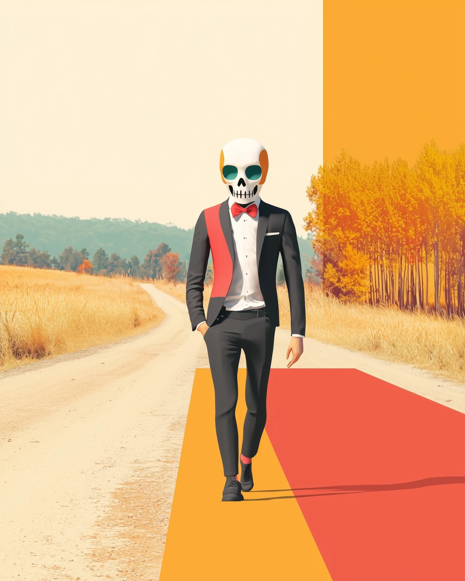 The image depicts a solitary figure hovering in the air above a desolate landscape shrouded in fog. The overall atmosphere evokes a sense of mystery and solitude, with muted colors blending into the misty background.