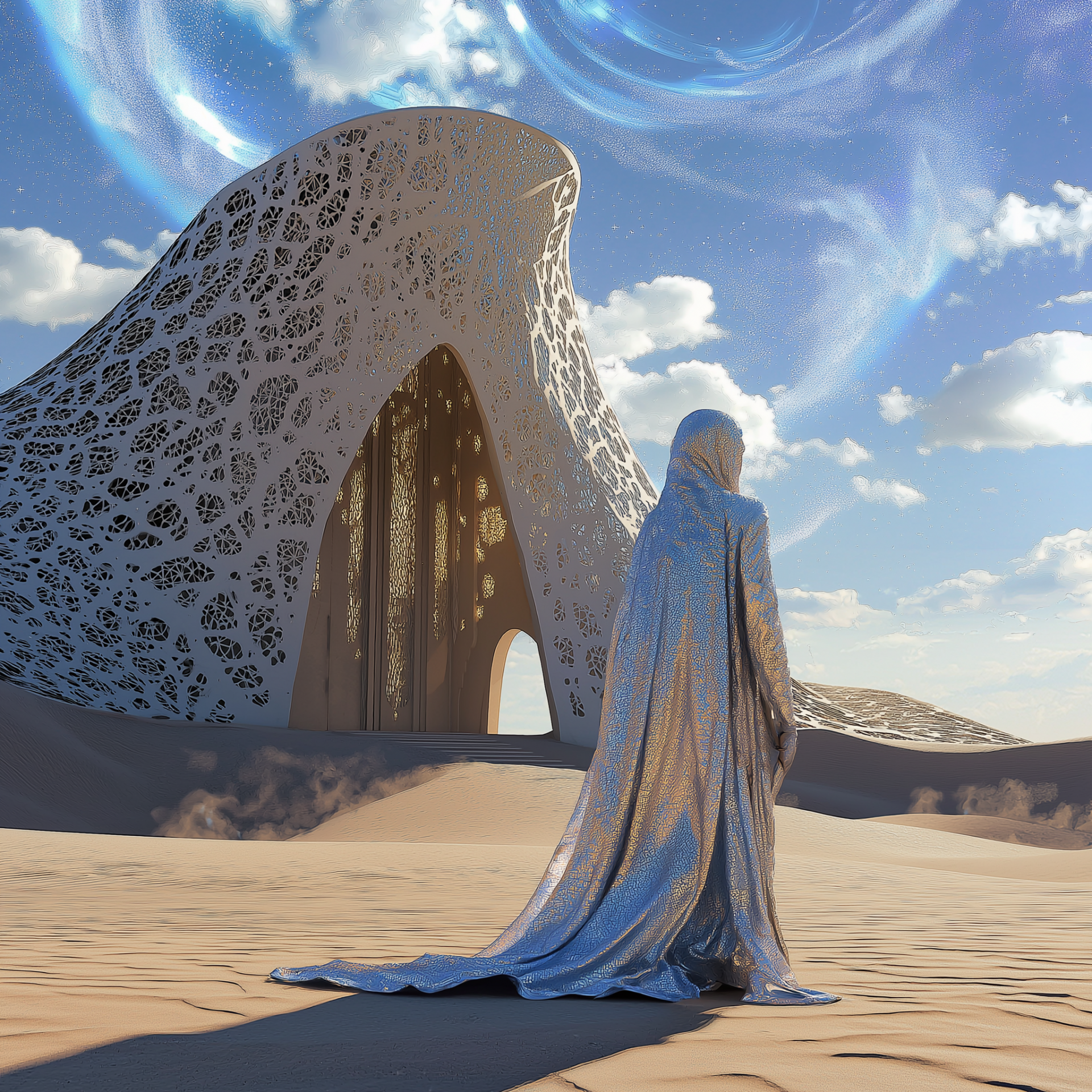 The image depicts a Sufi mystic enveloped in vibrant, flowing robes that exude a sense of spiritual grace. The colors and textures create a captivating visual experience, blending mysticism with modern fashion elements.