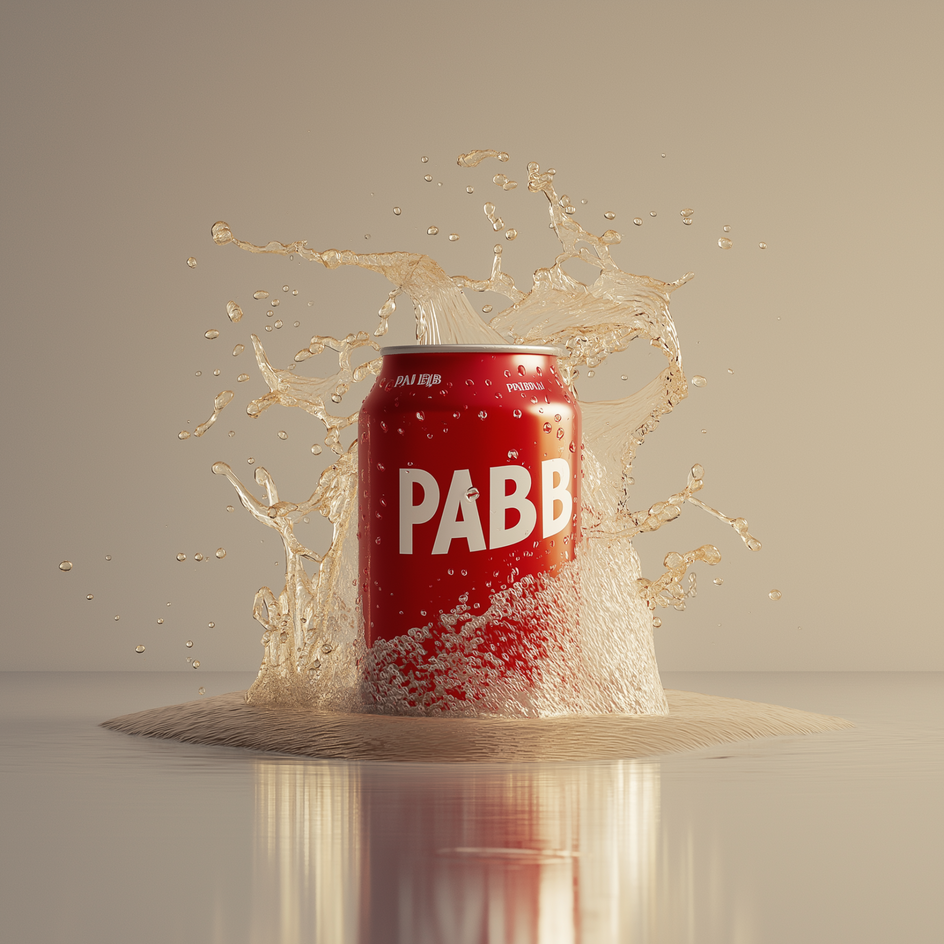 This image captures a lively splash of a soda can, radiating energy and excitement. The minimalist cream background and lens flare effect enhance the vibrant feel of the composition.