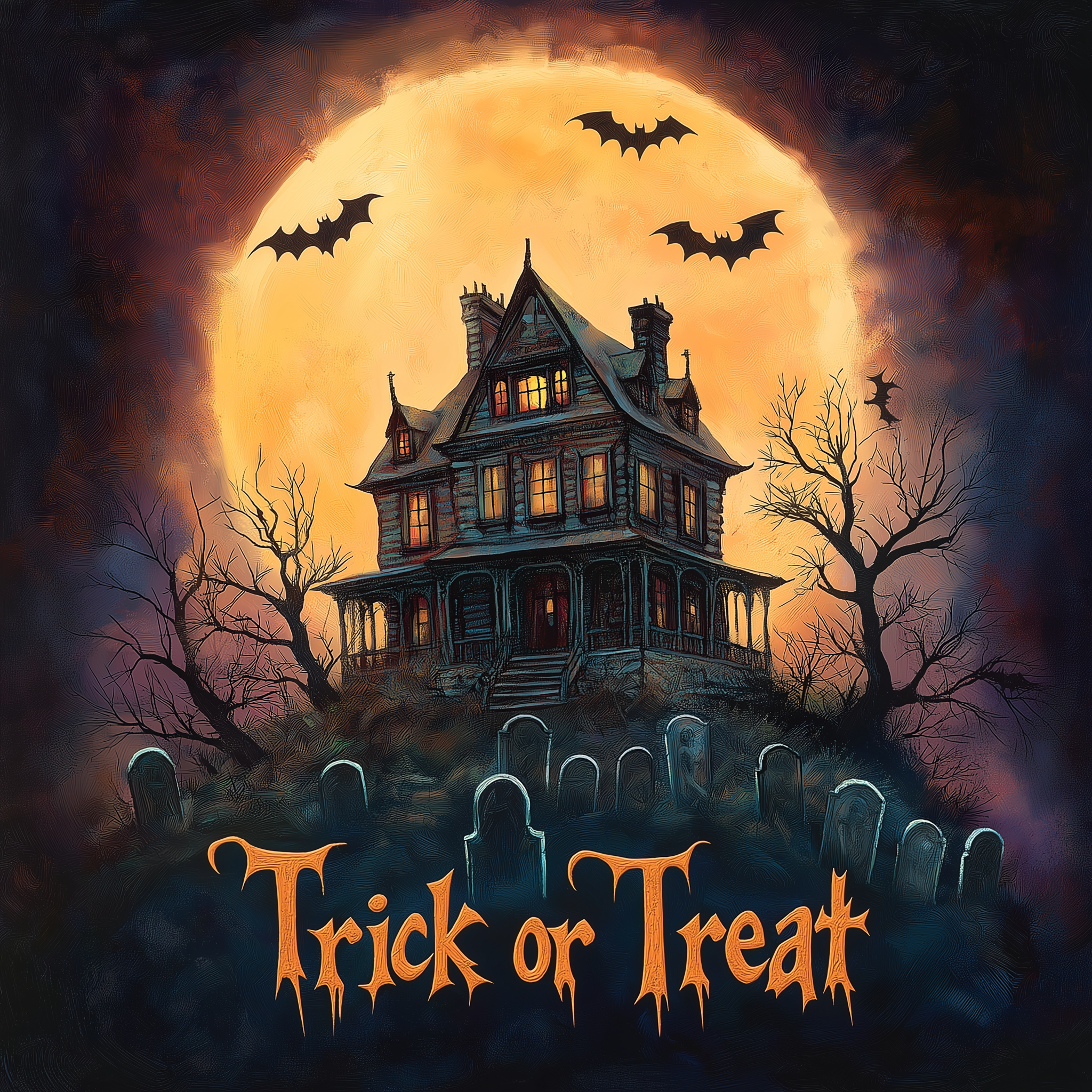This painting depicts a haunted Victorian house perched on a twisted hill, enveloped by barren trees and weathered gravestones. A glowing full moon casts dramatic shadows, enhancing the eerie atmosphere of the scene.