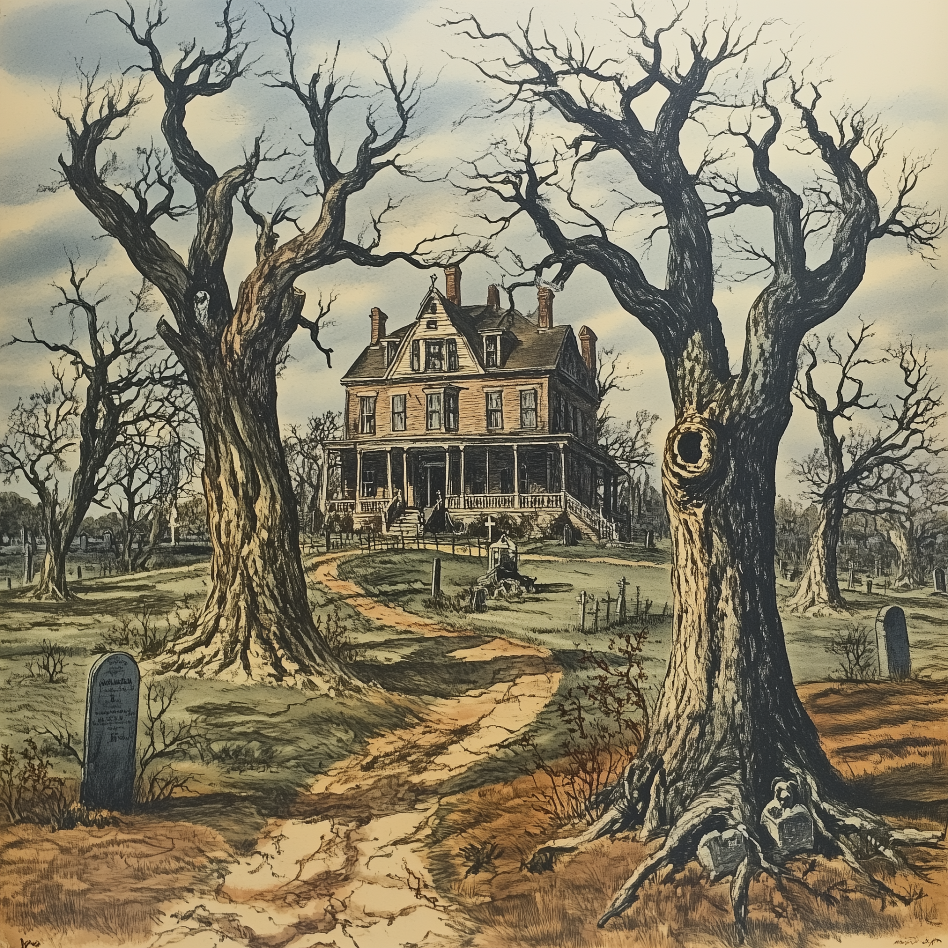 This vintage lithograph features a ghostly mansion surrounded by a desolate cemetery, evoking an eerie, mysterious atmosphere. Large, dead oak trees loom over the scene, enhancing the haunting vibe of the artwork.