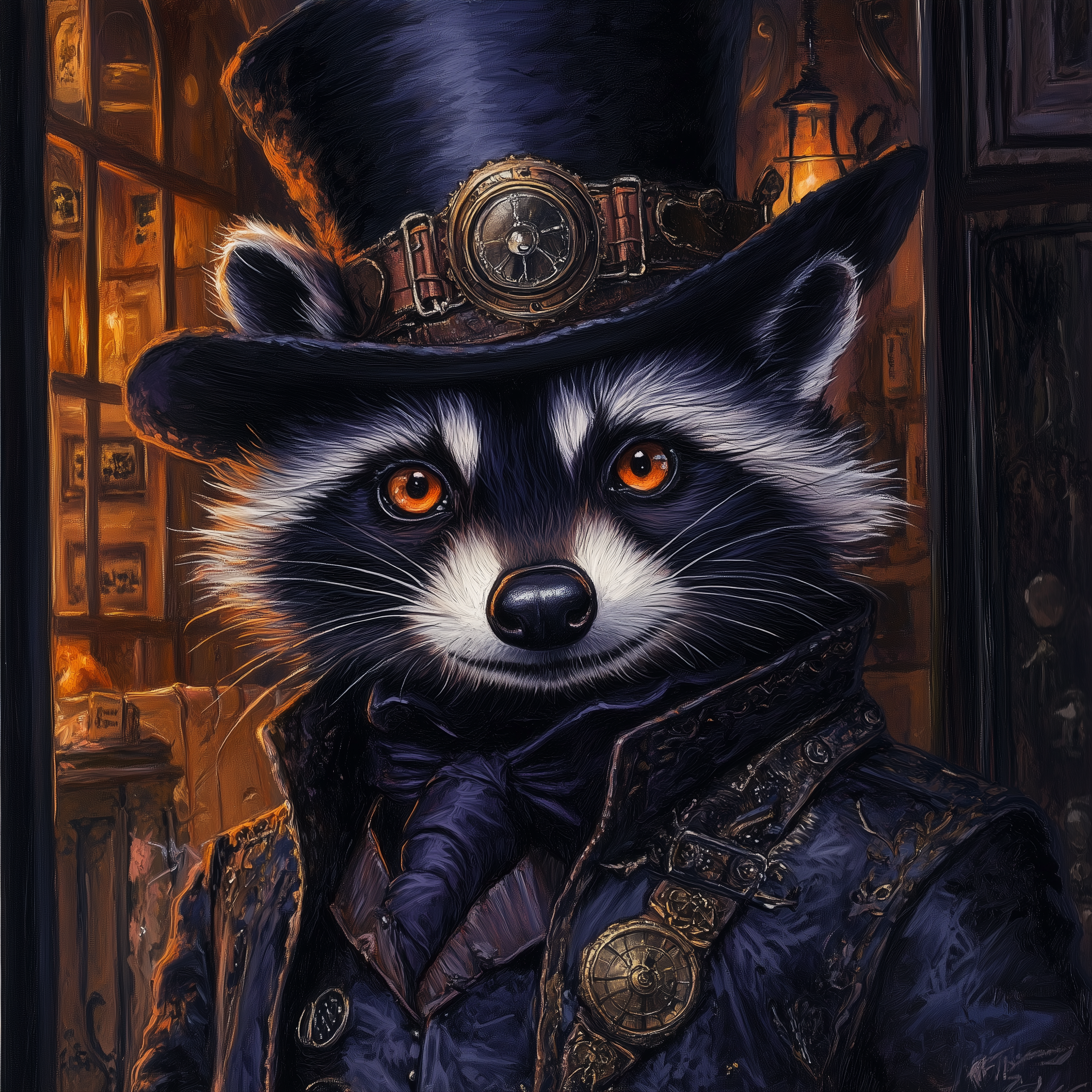 This illustration portrays a whimsical raccoon dressed in a steampunk coat and a black top hat, set against the backdrop of a spooky antique shop. The vibrant colors of black, orange, and purple create a fantastical and detailed atmosphere.