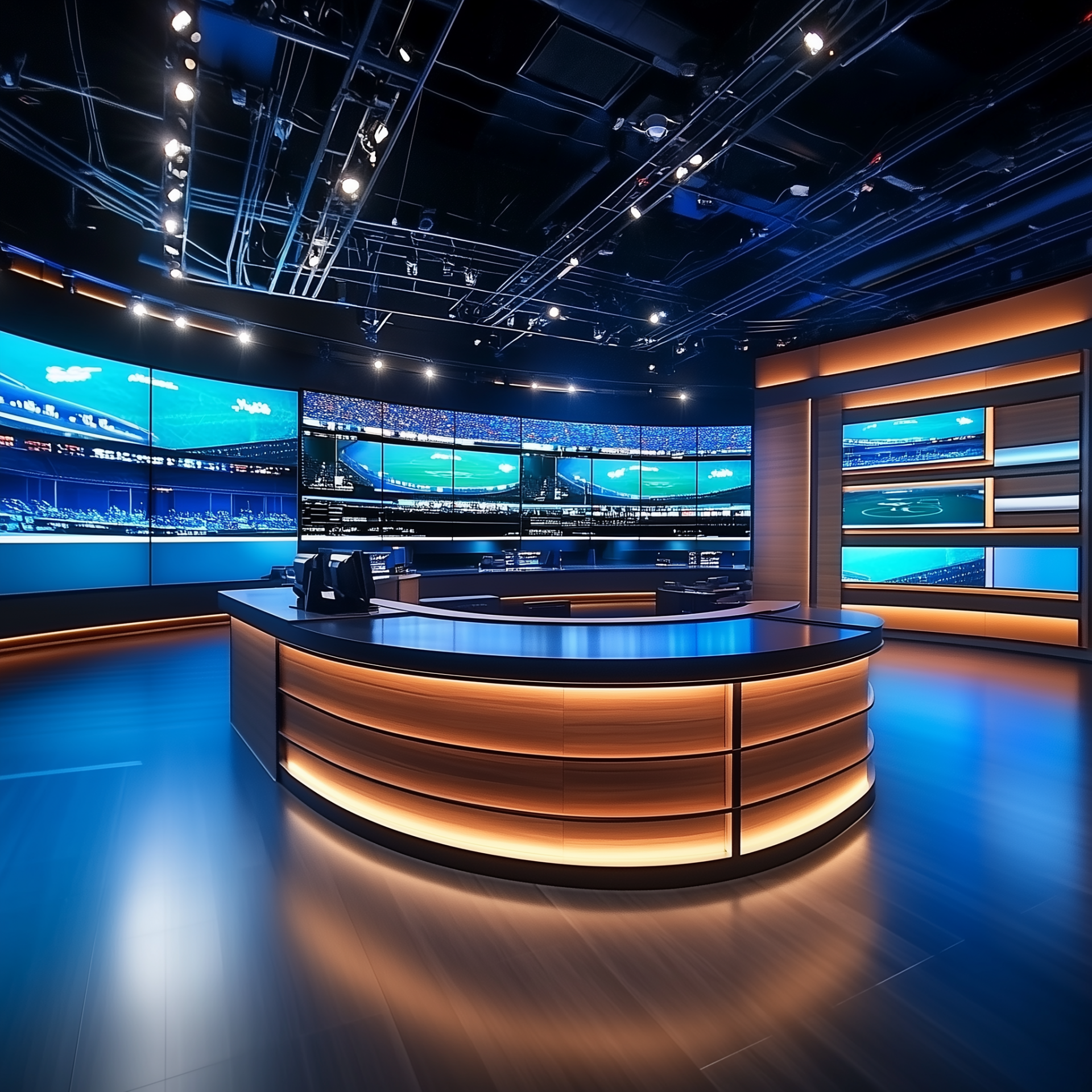 The image showcases a modern sports TV studio set featuring a sleek and professional design. Warm and balanced lighting creates an inviting atmosphere, perfect for broadcasting sporting events.