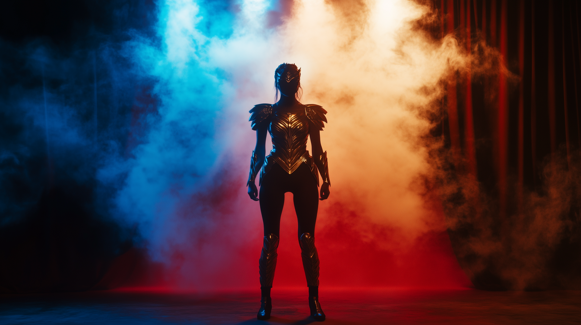 In this striking image, a high school woman is captured in a dramatic silhouette behind a curtain, showcasing a modern Greek epic Rhea costume. The vibrant colors of red, white, and gold are enhanced by illuminating LED lights and colorful powder smoke, creating a dynamic and hyper-realistic atmosphere.