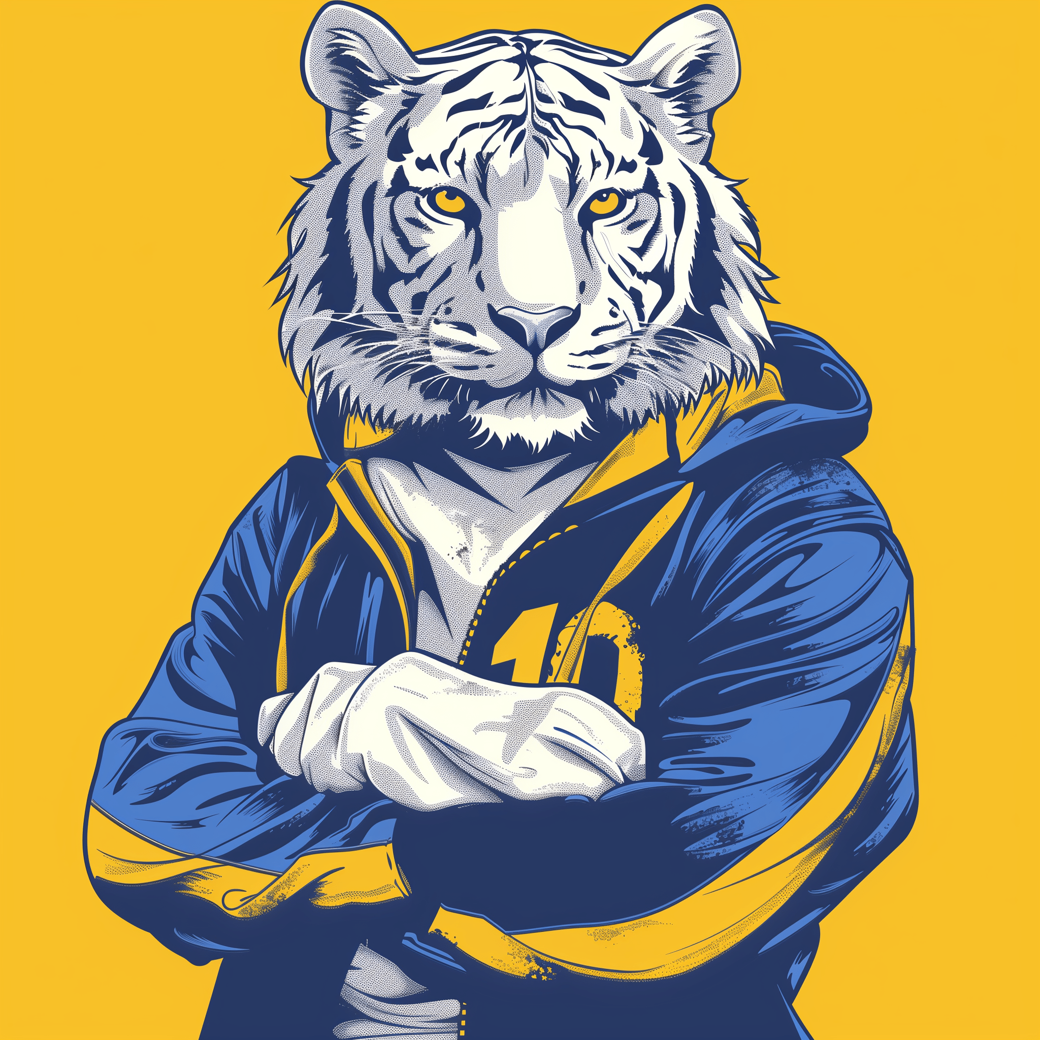 A clean graphic illustration of a teenage white tiger showcasing athleticism in a school sports uniform with blue and yellow colors.