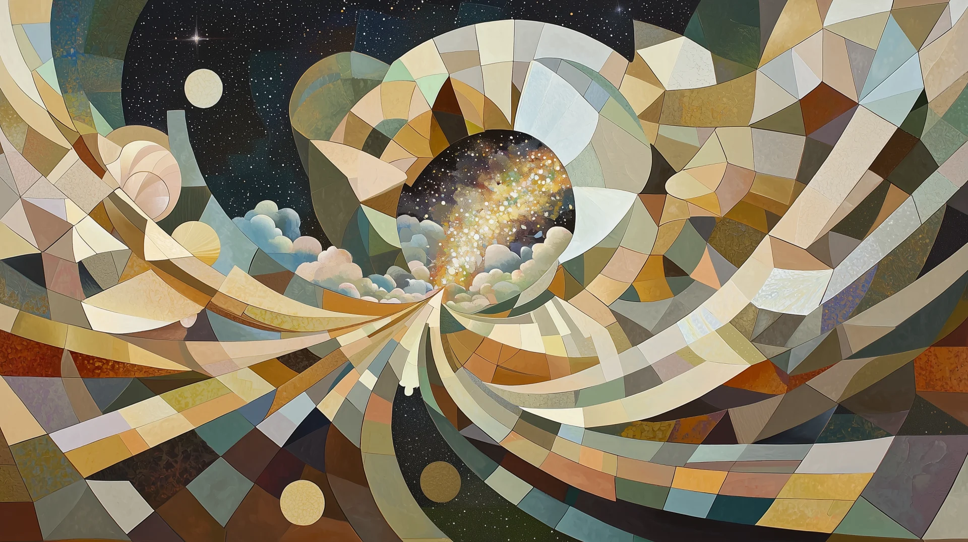 This illustration depicts a luminous golden path illuminating the cosmos, leading human figures through a starry expanse. The soft, radiant light creates a serene and magical atmosphere, inspiring a sense of wonder and exploration.