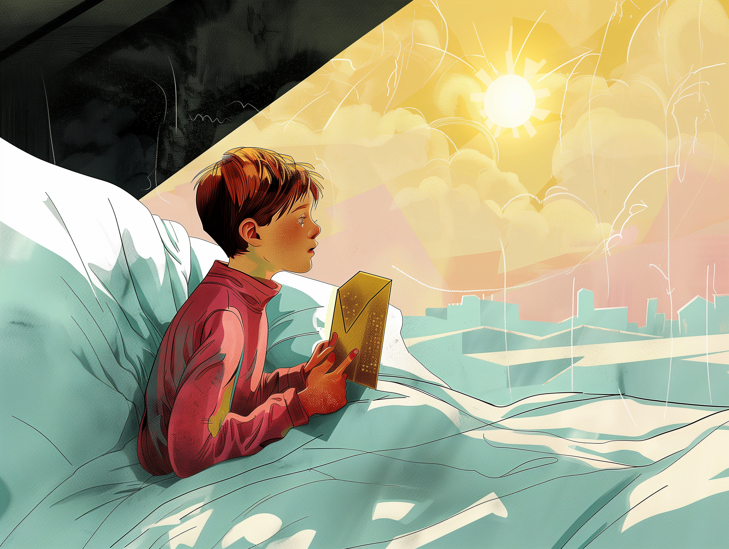 An illustration of a young boy with short hair sitting on his white bed, gently holding a lovely small envelope. Soft sunlight streams into his room, creating a peaceful and serene atmosphere.
