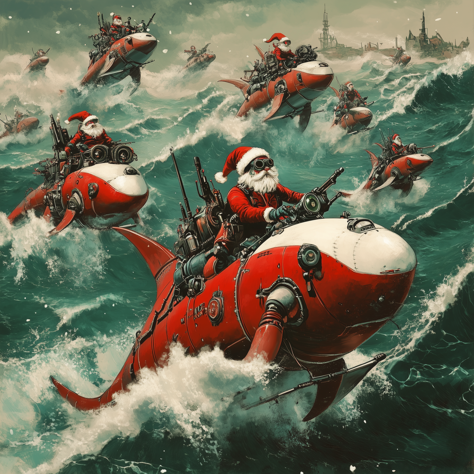 This illustration depicts a vibrant scene filled with a diverse army of cyborg Santas. They are speeding across the ocean on various steampunk-inspired vehicles, showcasing a lively blend of red, green, and white metallic colors as they leap over the waves.