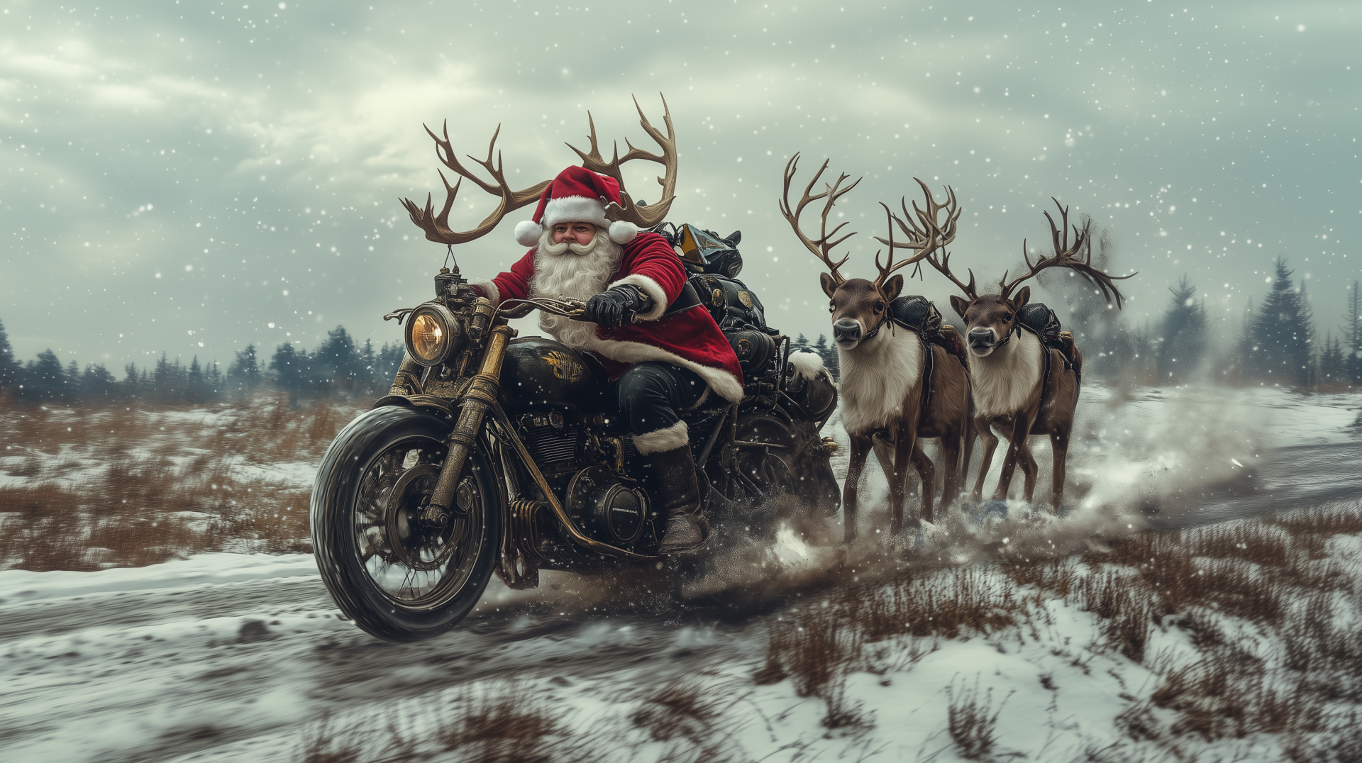 The image features a whimsical representation of Santa Claus riding a motorcycle in a steampunk style, surrounded by his reindeers. The overall color palette has a greyish tone, adding to the unique and fantastical atmosphere of the scene.