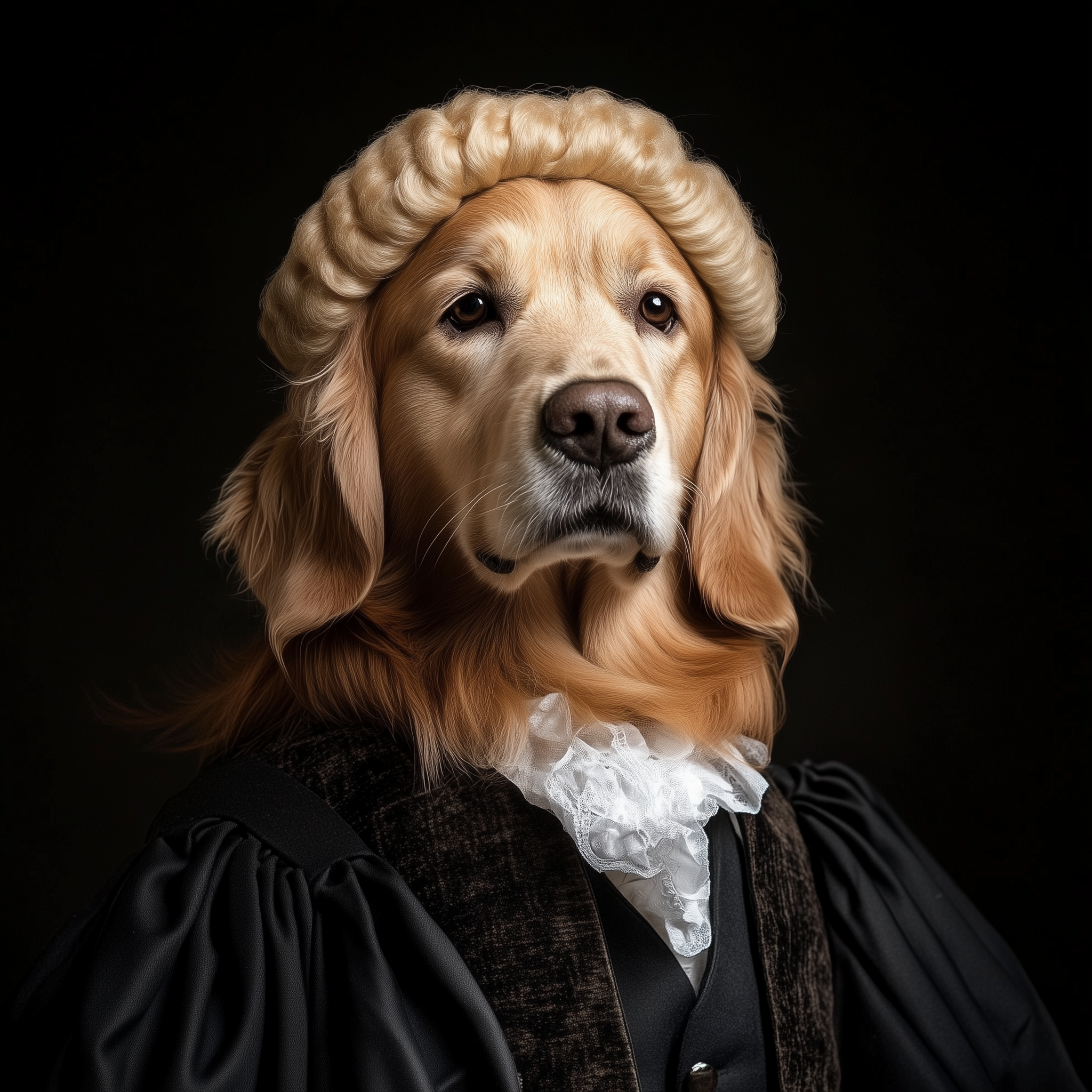 A whimsical high art photograph featuring a golden retriever dressed as a British barrister, complete with a wig. The subject meets the viewer's gaze with a sense of sophistication and charm.