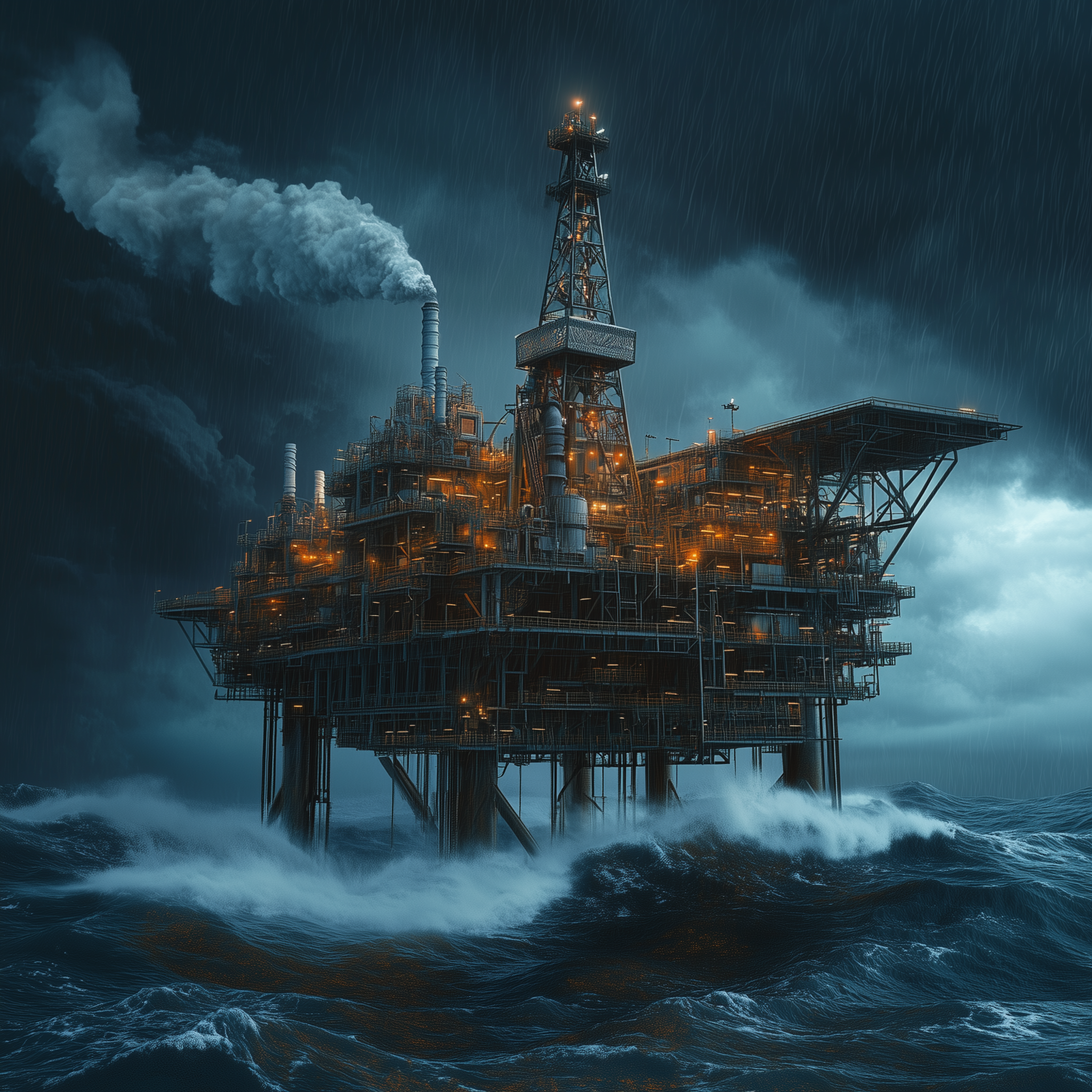A dramatic scene of an offshore oil refinery being hit by storm waves during daylight, creating a dark and intense atmosphere. The high-quality 3D render showcases intricate details in the tumultuous sea and industrial structure.