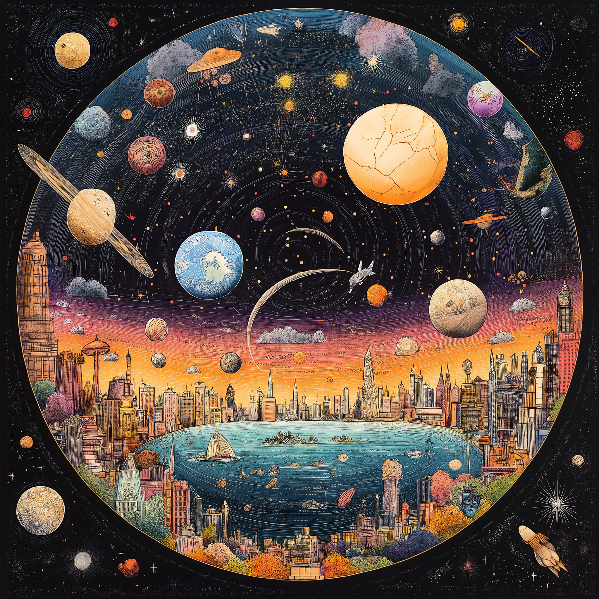 An ethereal and expansive illustration depicting the vast universe with a captivating focus on the scenic beauty of Queens' bayside area at its heart.