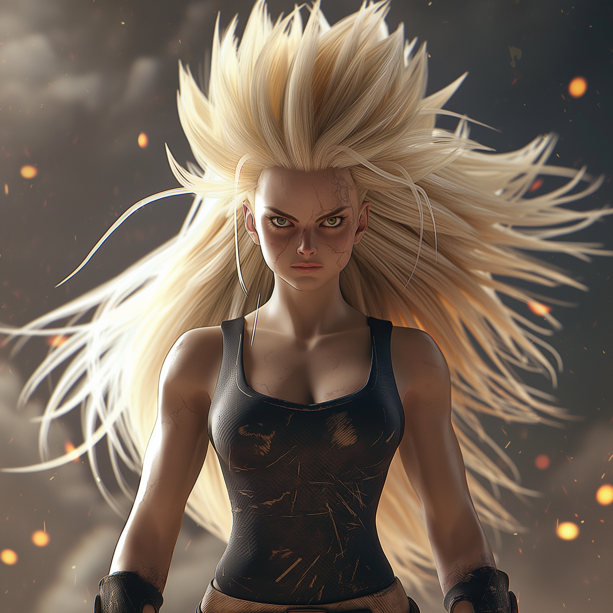 An illustration depicting a powerful female Super Saiyan in a dynamic pose, showcasing her vibrant energy and determination. The background shows the iconic landscapes of planet Vegeta, adding to the epic feel of the scene.