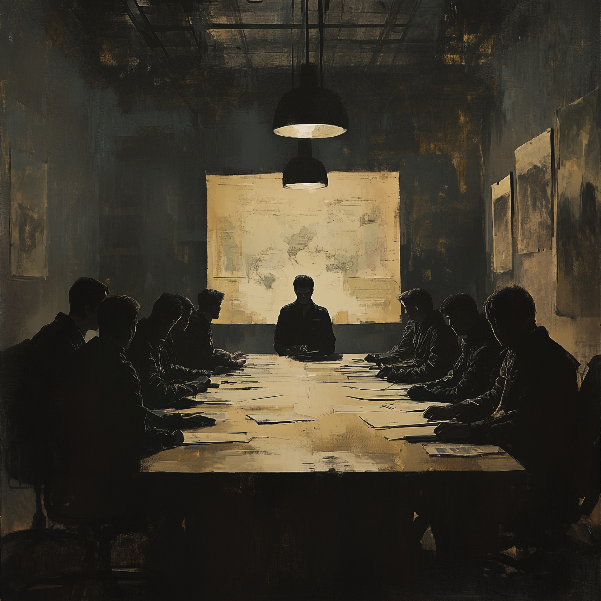 The image depicts a dimly lit conference room filled with shadowy figures sitting around a long table. The atmosphere is tense, with muted tones and scattered papers enhancing the feeling of conflict and authority.