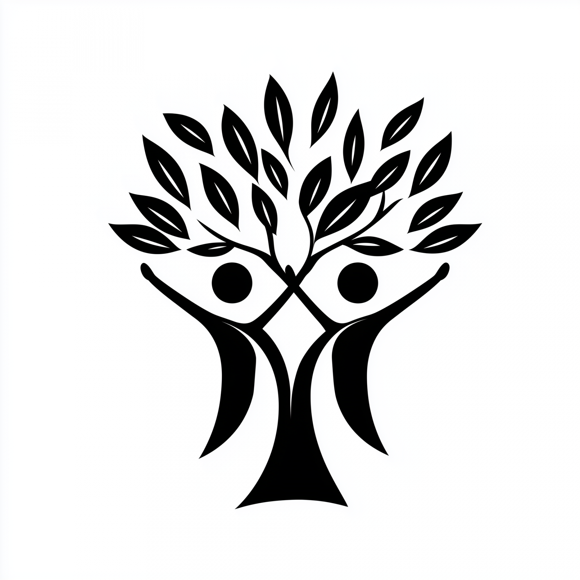 The image features a minimalist logo composed of two stick figures whose hands are joined above their heads, creating a tree-like shape. The black and white contrast emphasizes the unity and simplicity of the design.