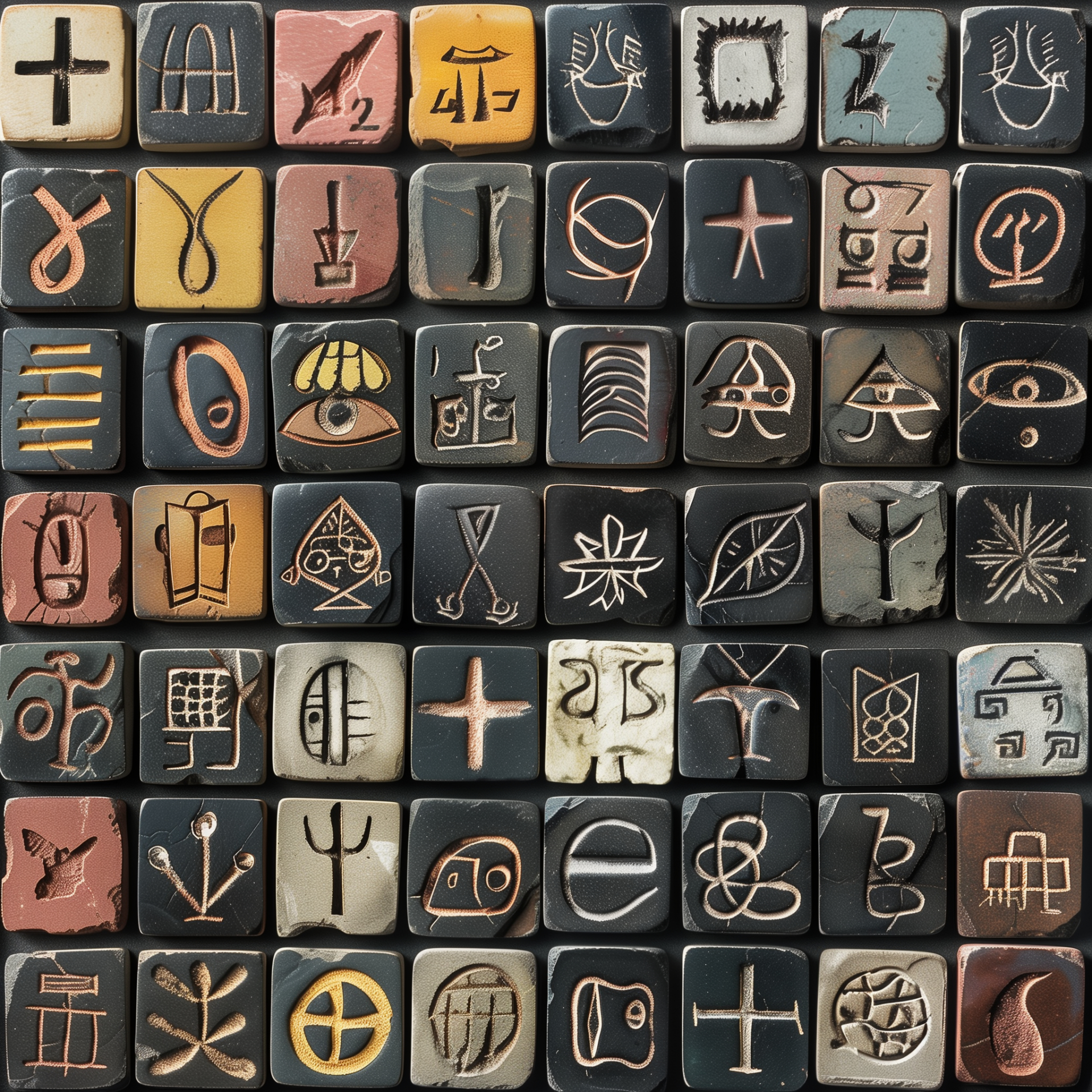 This image showcases a clean grid of 66 matte stone tiles. Each tile features a unique hand design, creating an eye-catching and artistic arrangement.